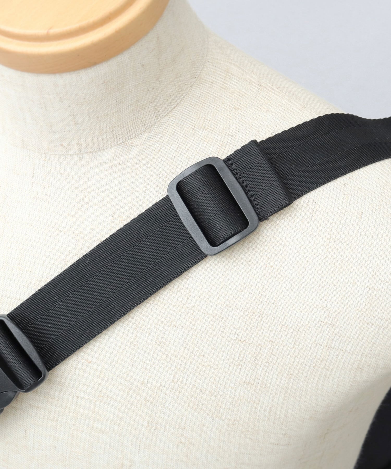 幅広のショルダーベルトは、体型や用途に合わせてサイズ調節が可能。バックル仕様でワンタッチ着脱できるのもポイント。両サイドには、キーホルダーなどの取り付けに便利なDカンを配置。