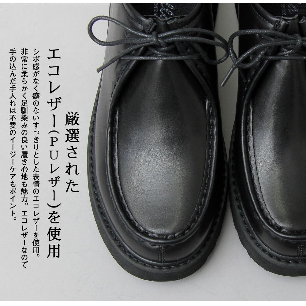 シボ感がなく癖のないすっきりとした表情のエコレザーを使用。非常に柔らかく足馴染みの良い履き心地も魅力。エコレザーなので手の込んだ手入れは不要のイージーケアもポイント。