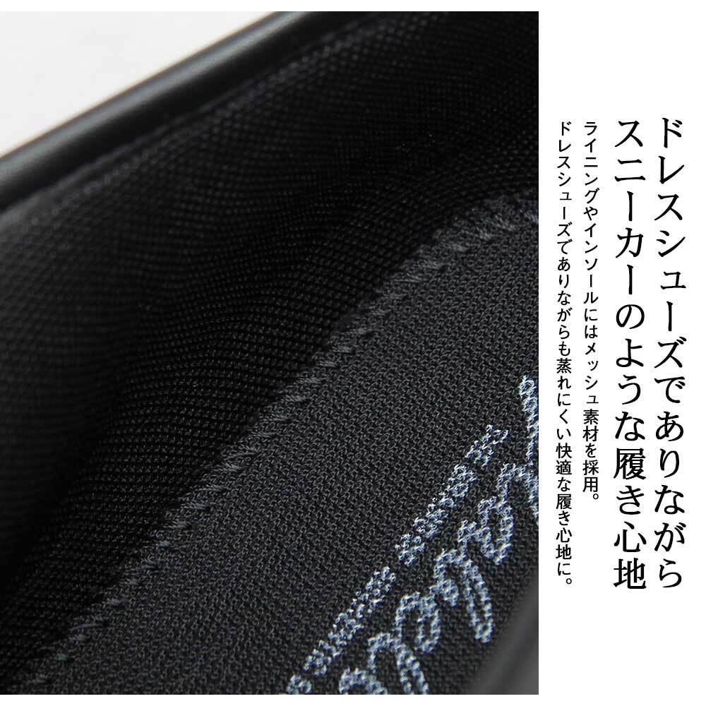ライニングやインソールにはメッシュ素材を採用。ドレスシューズでありながらも蒸れにくい快適な履き心地に。