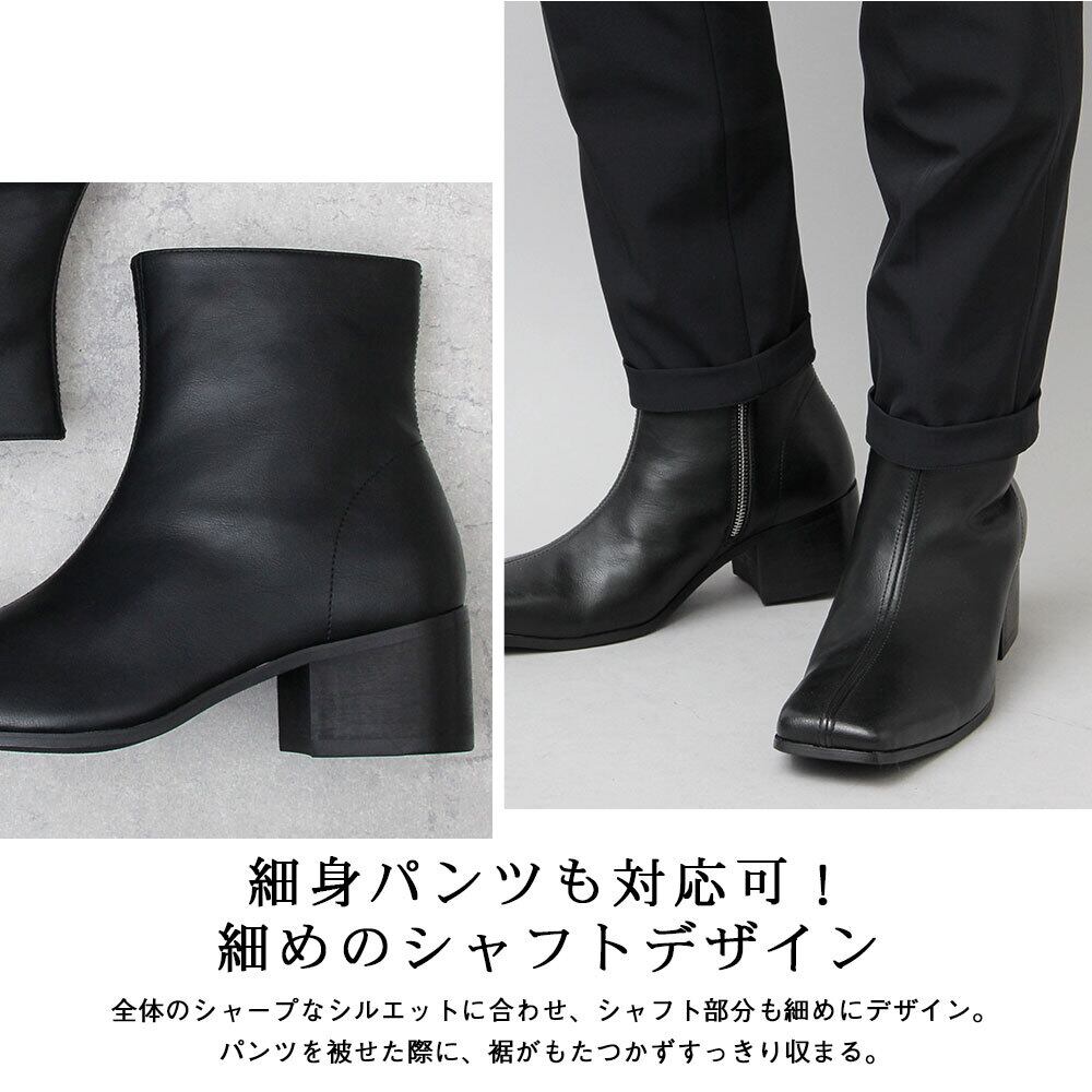メンズでも注目度の上がっているスクエアトゥデザインは、ミニマルでモードな雰囲気が魅力。スクエアトゥにセンターシームを合わせたシンプルなデザインなので、パンツの合わせを選ばず使い勝手抜群。ラフでカジュアルな装いにもモードな雰囲気をプラスしてくれます。ハイヒールでありながらも、ヒールは安定感のある太いヒールなので、ヒールブーツ初心者の方にもおすすめできます。黒スキニーやスラックスとの合わせはもちろん、トラックパンツやワイドパンツ合わせなど、エッジの効いた組み合わせも面白そうです。ヒールブーツはスタイルアップ効果もあるのでおすすめ!