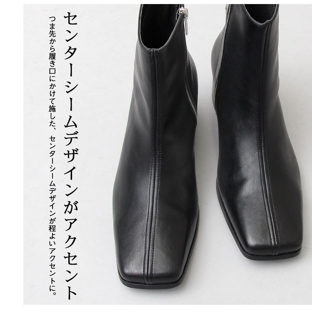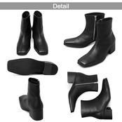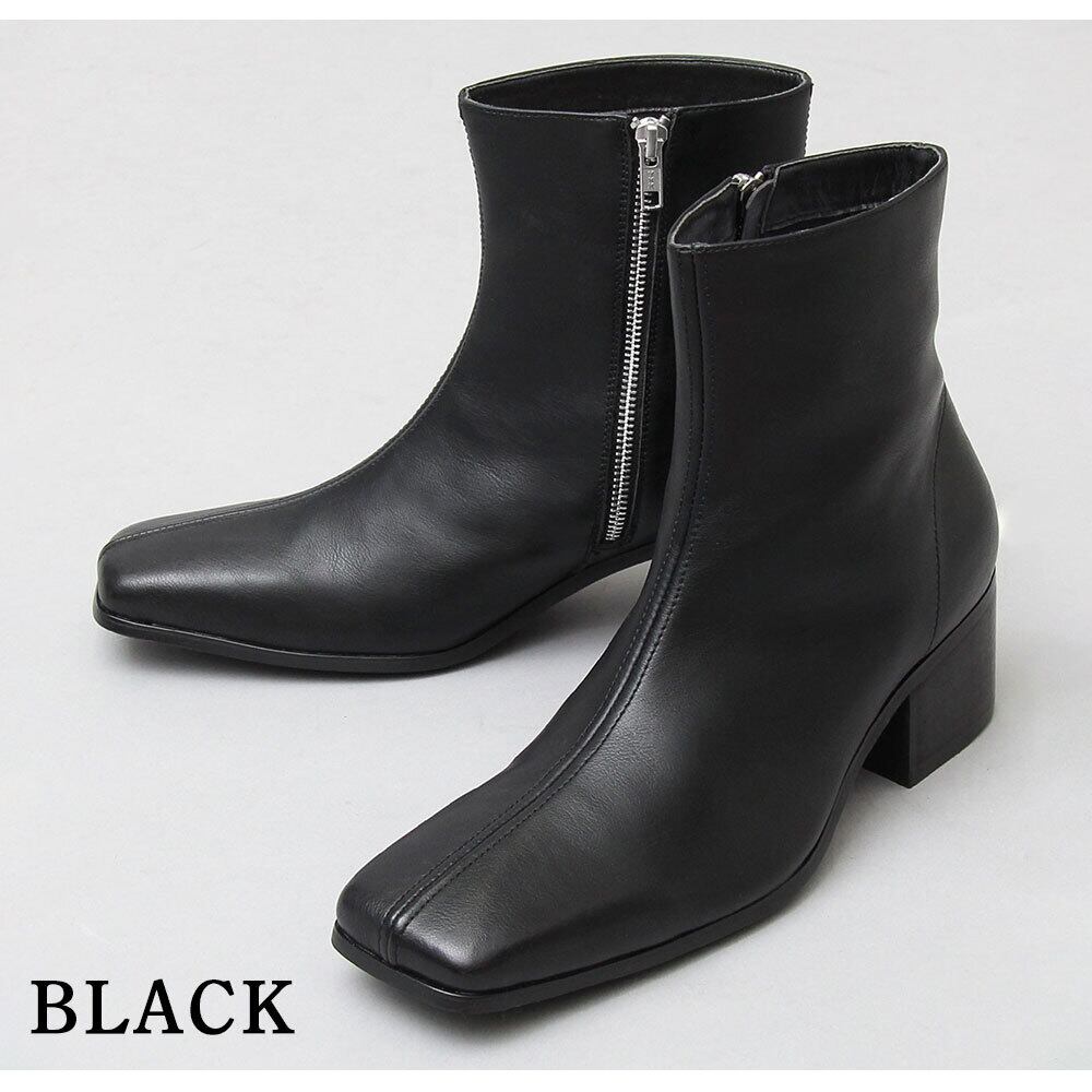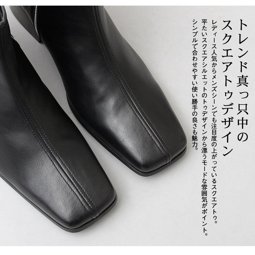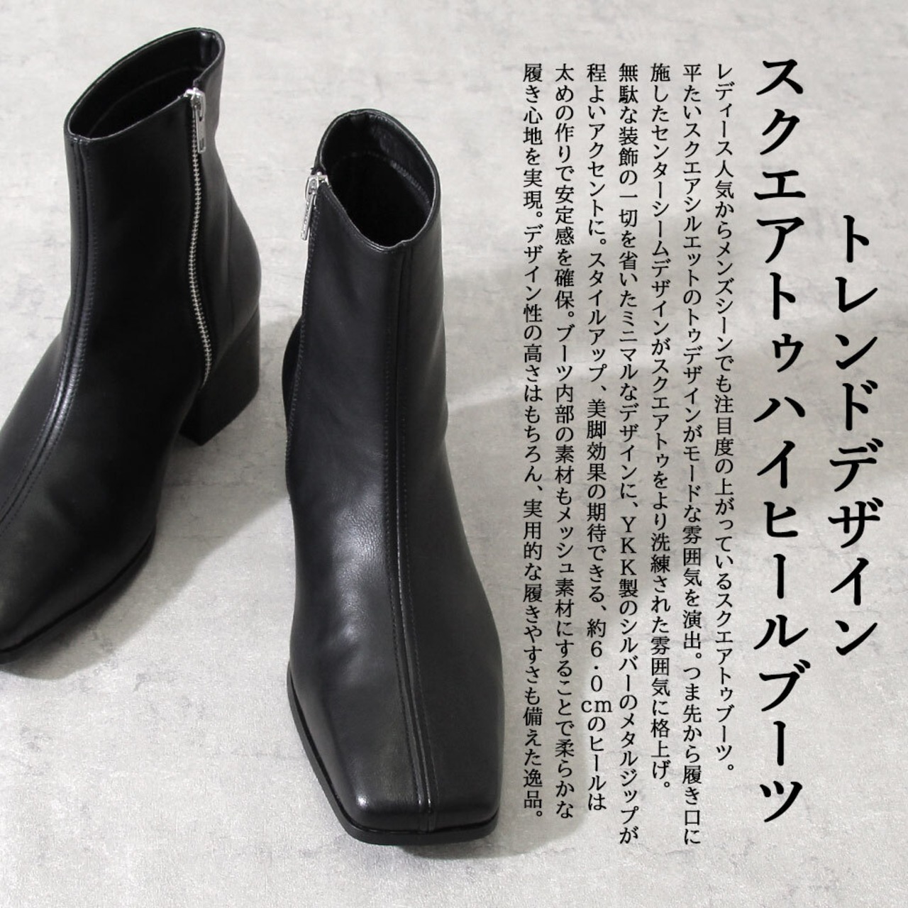 レディース人気からメンズシーンでも注目度の上がっているスクエアトゥブーツ。平たいスクエアシルエットのトゥデザインがモードな雰囲気を演出。つま先から履き口に施したセンターシームデザインがスクエアトゥをより洗練された雰囲気に格上げ。無駄な装飾の一切を省いたミニマルなデザインに、YKK製のシルバーのメタルジップが程よいアクセントに。スタイルアップ、美脚効果の期待できる、約6.0cmのヒールは、太めの作りで安定感を確保。ブーツ内部の素材もメッシュ素材にすることで柔らかな履き心地を実現。デザイン性の高さはもちろん、実用的な履きやすさも備えた逸品。