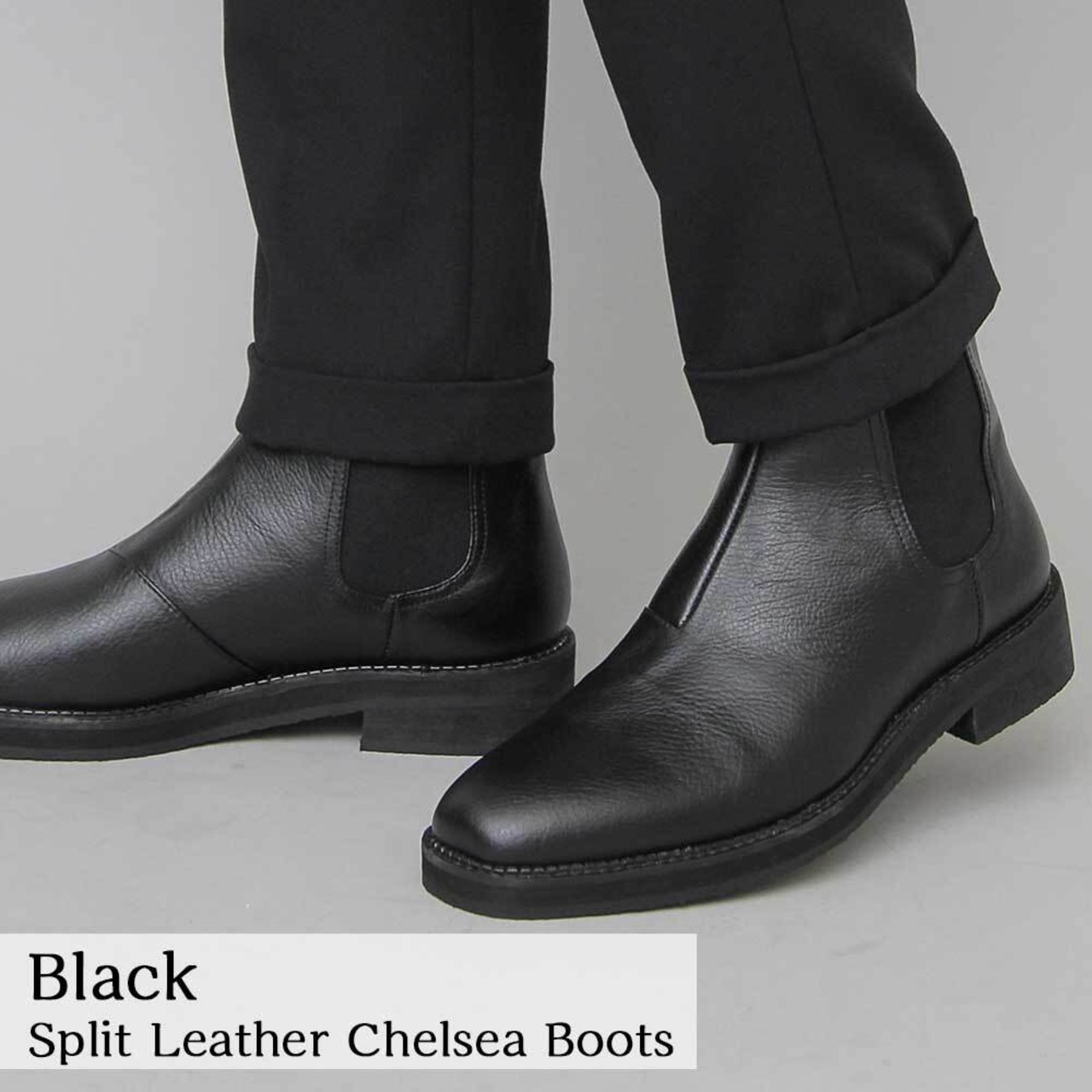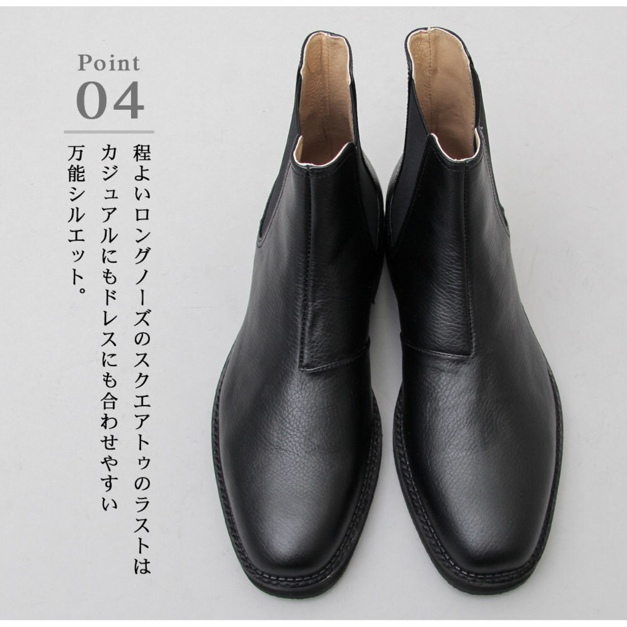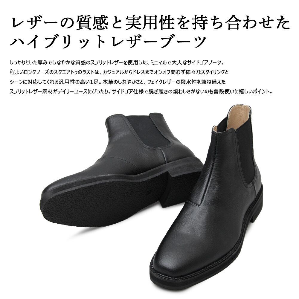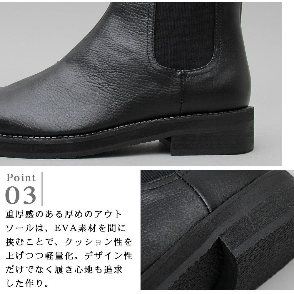 しっかりとした厚みでしなやかな質感のスプリットレザーを使用した、ミニマルで大人なサイドゴアブーツ。程よいロングノーズのスクエアトゥのラストは、カジュアルからドレスまでオンオフ問わず様々なスタイリングとシーンに対応してくれる汎用性の高い1足。本革のしなやかさと、フェイクレザーの撥水性を兼ね備えたスプリットレザー素材がデイリーユースにぴったり。サイドゴア仕様で脱ぎ履きの煩わしさがないのも普段使いに嬉しいポイント。