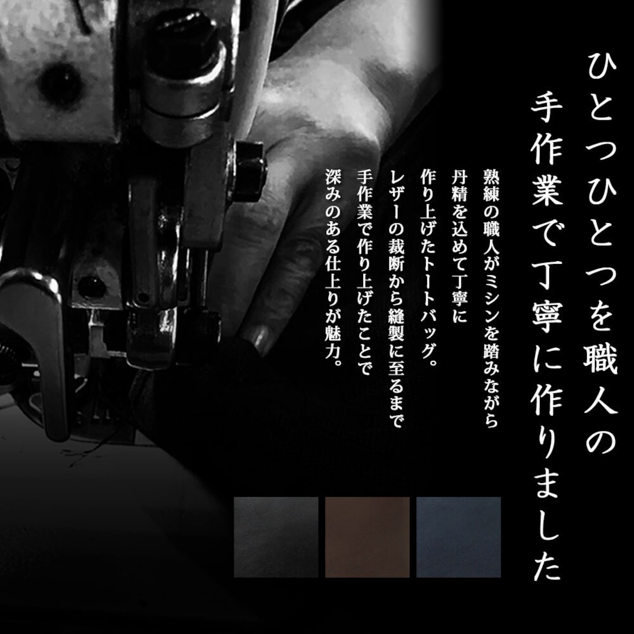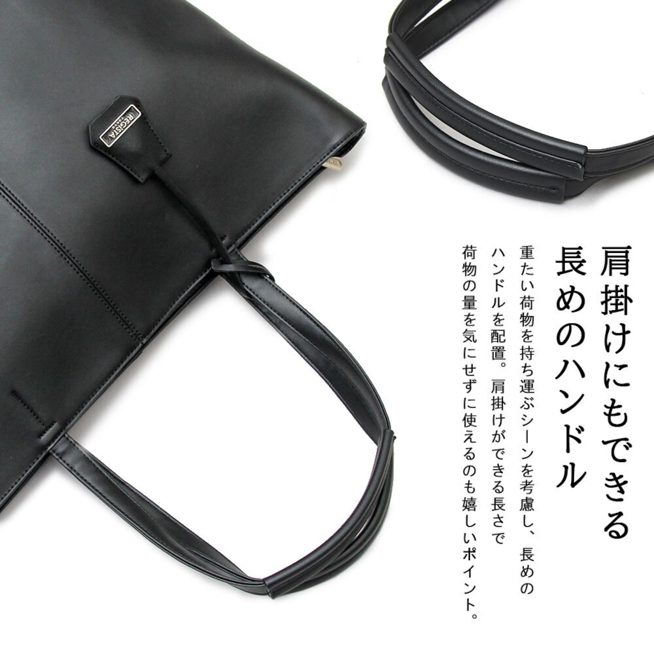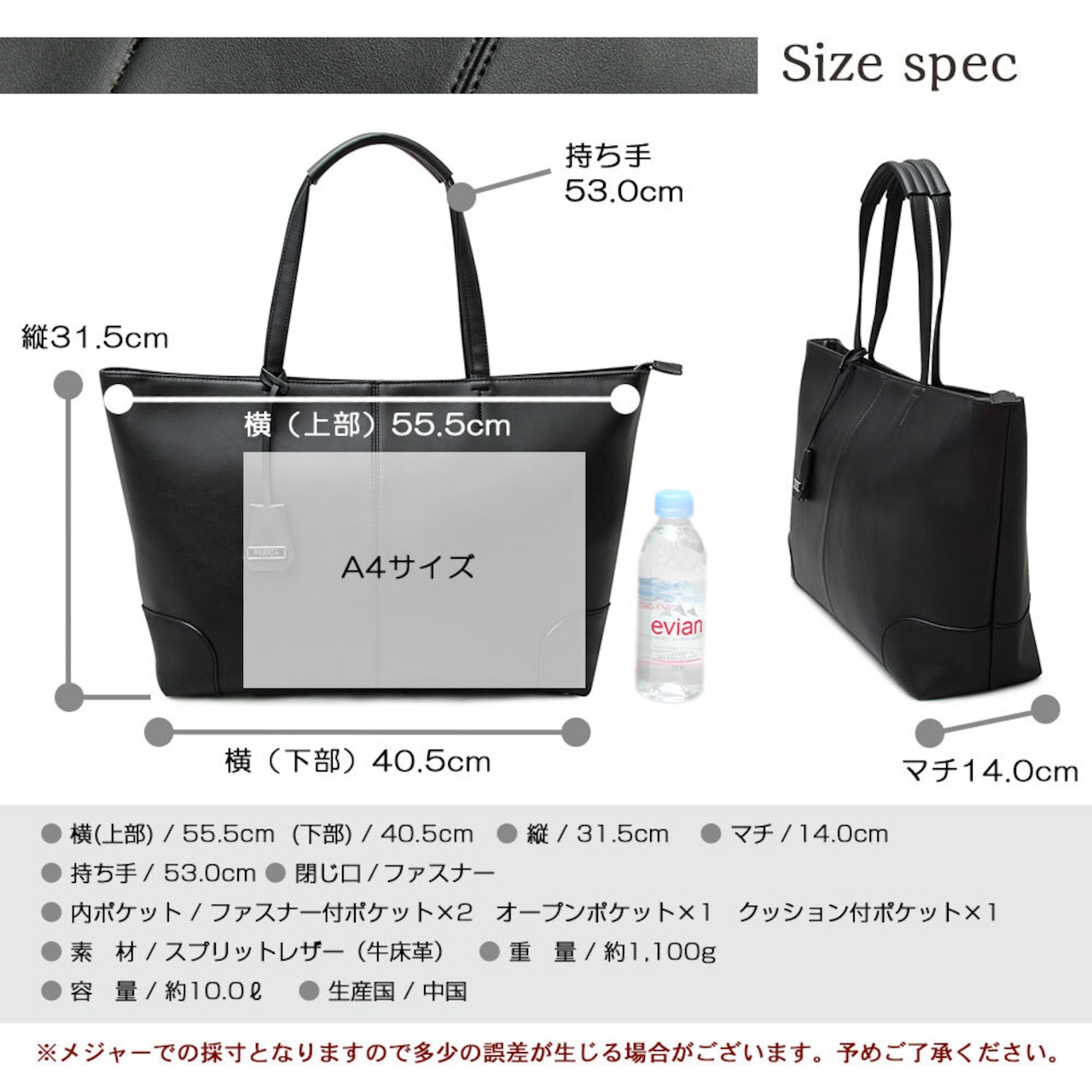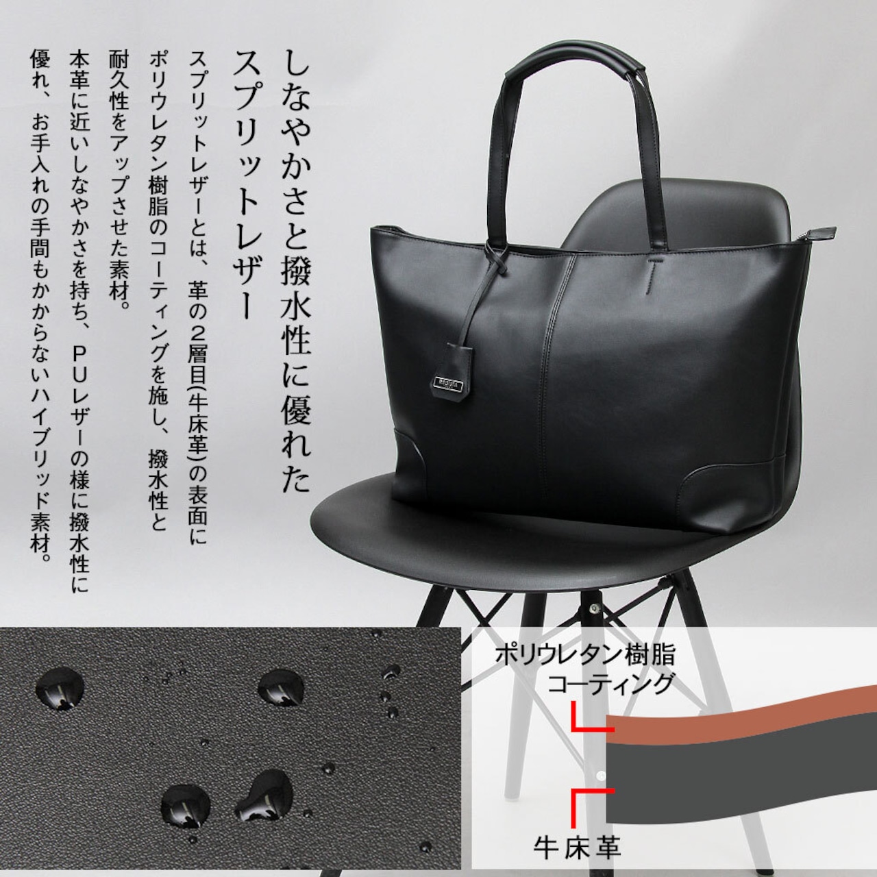 スプリットレザー(牛床革)を使用したシンプルなデザインのトートバッグ。厚みのあるしっかりとしたスプリットレザー(牛床革)を使用した、しなやかな質感と落ち着いた光沢感が魅力。横幅を約55センチとったメインの収納部分はA4サイズ対応で、仕事用の書類やタブレット端末も収納可能。重たい荷物を持ち運ぶシーンも考慮し、長めのハンドルに設計。底面には傷や汚れが付きにくい底鋲を配置。シンプルなデザイン性と高い機能性で、オンオフ問わず活躍できる万能トート。