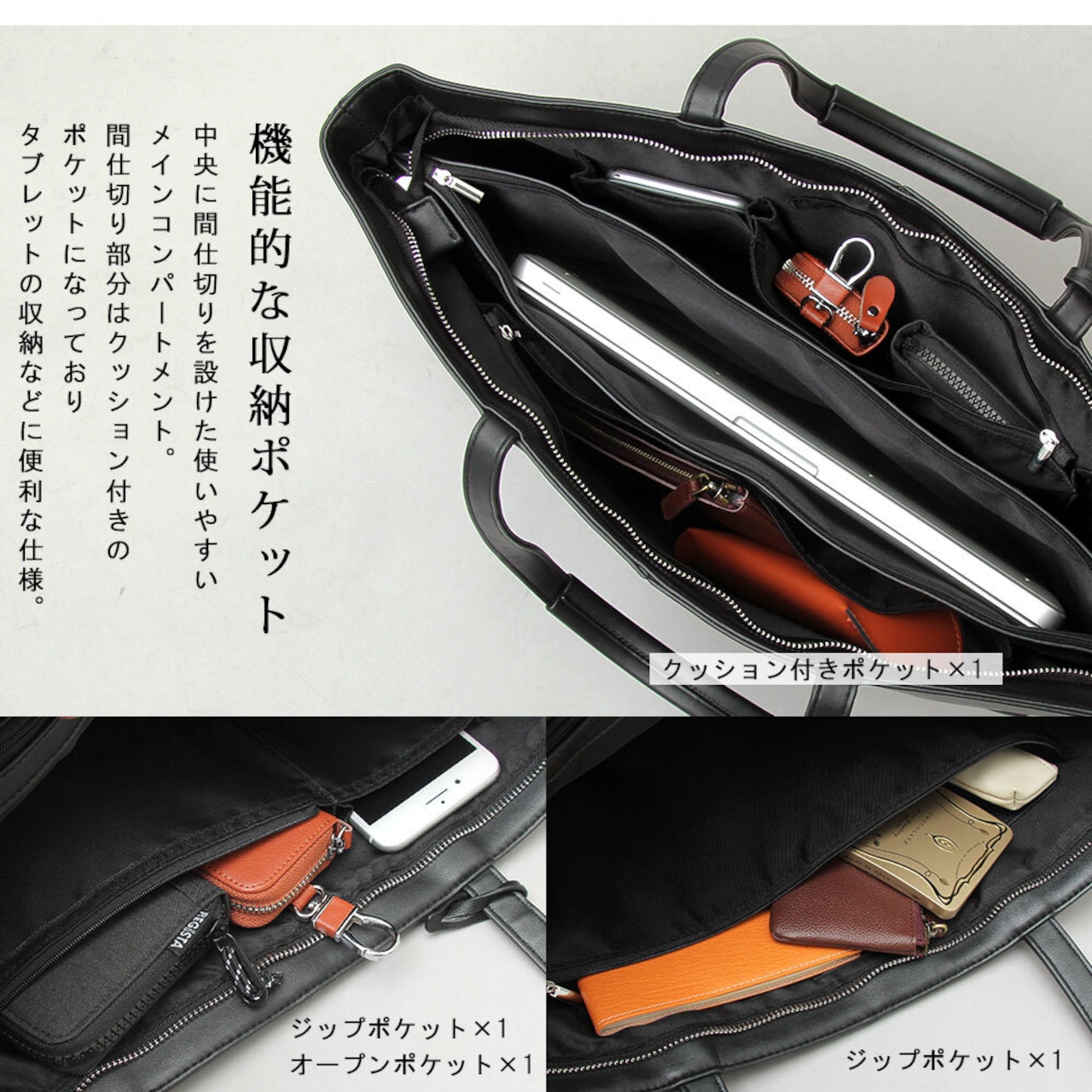 レザーらしい重厚感のあるしっかりとした見た目ですが、バッグ自体は思ったより軽量で使いやすそうです。バッグ本体もしっかりと自立するので荷物の出し入れもスムーズに行えます。長めのハンドルで、アウターの上から肩掛けができるのも嬉しいポイントです。仕事バッグにおすすめです!