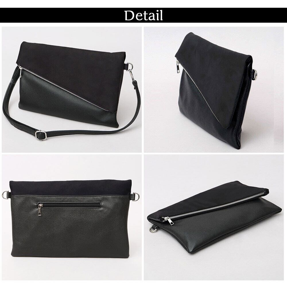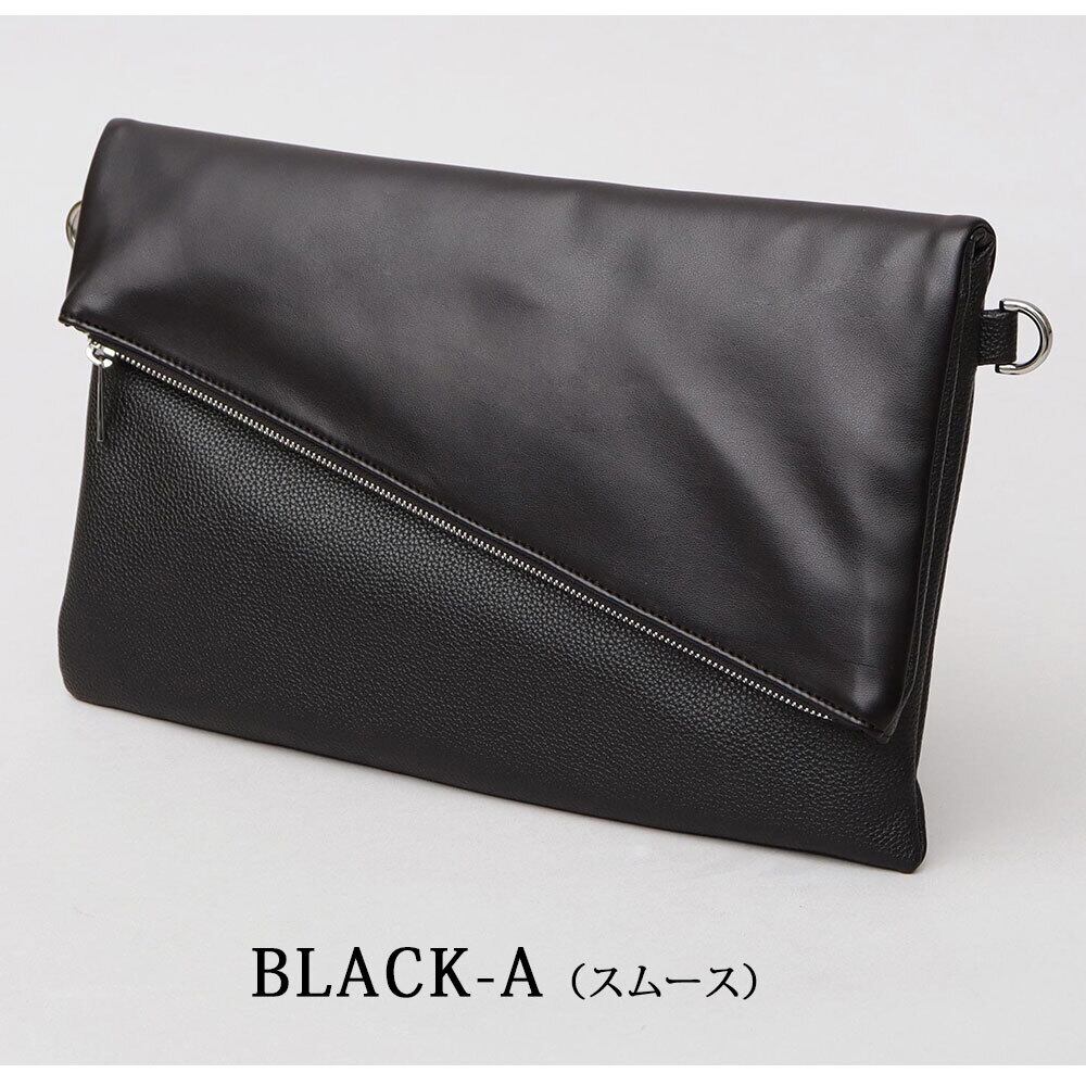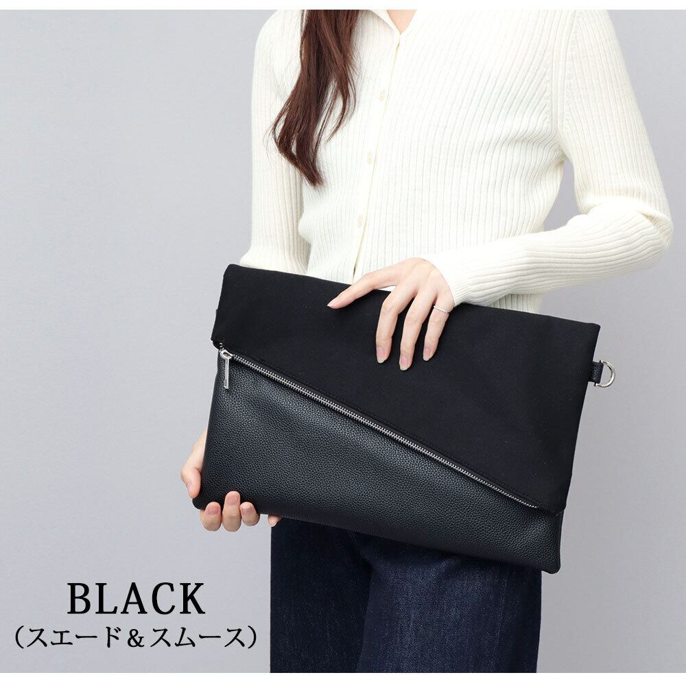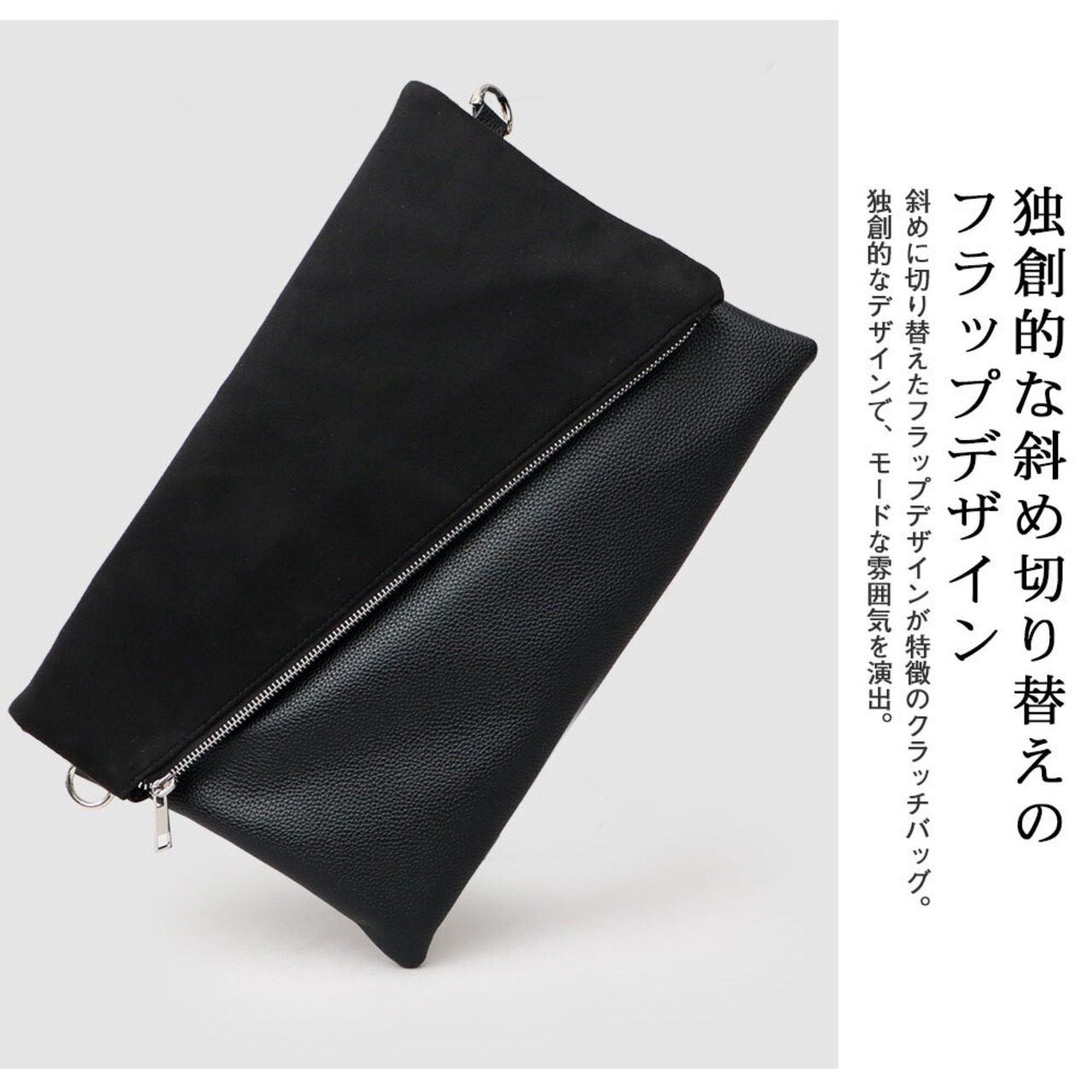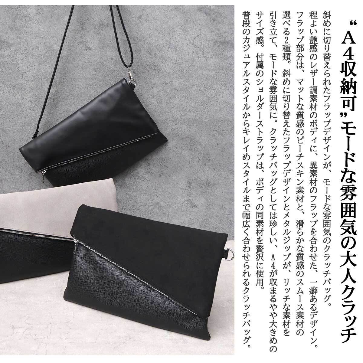斜めに切り替えられたフラップデザインが、モードな雰囲気のクラッチバッグ。程よい艶感のレザー調素材のボディに、異素材のフラップを合わせた、一癖あるデザイン。フラップ部分は、マットな質感のピーチスキン素材と、滑らかな質感のスムース素材の選べる2種類。斜めに切り替えたフラップデザインとメタルジップが、リッチな素材を引き立て、モードな雰囲気に。クラッチバッグとしては珍しい、A4が収まるやや大きめのサイズ感。付属のショルダーストラップは、ボディの同素材を贅沢に使用。普段のカジュアルスタイルからキレイめスタイルまで幅広く合わせられるクラッチバッグ。
