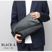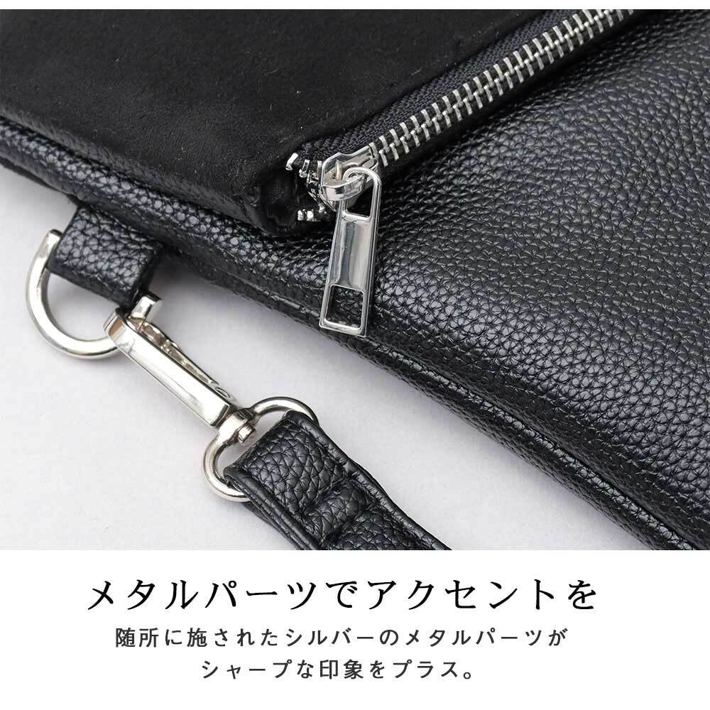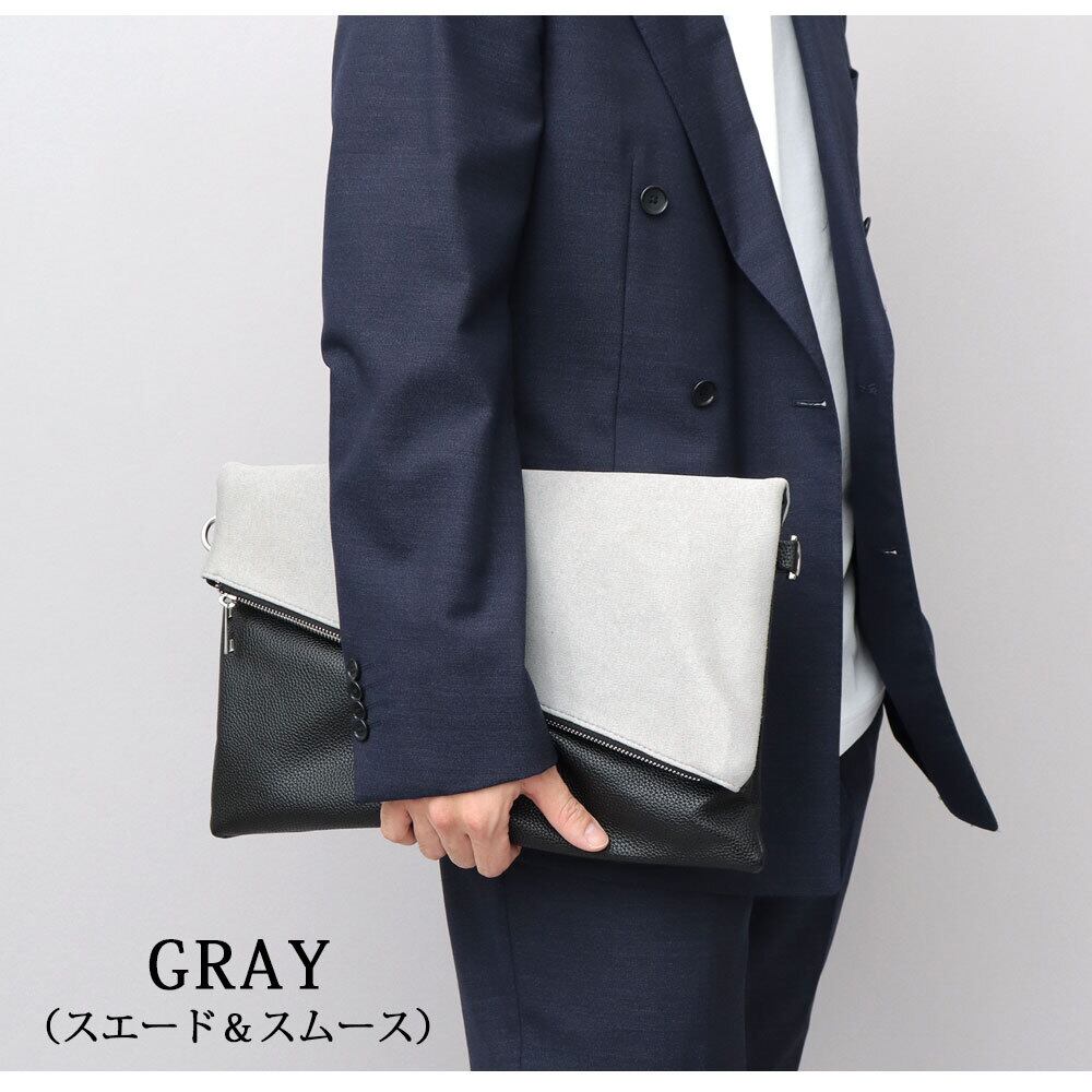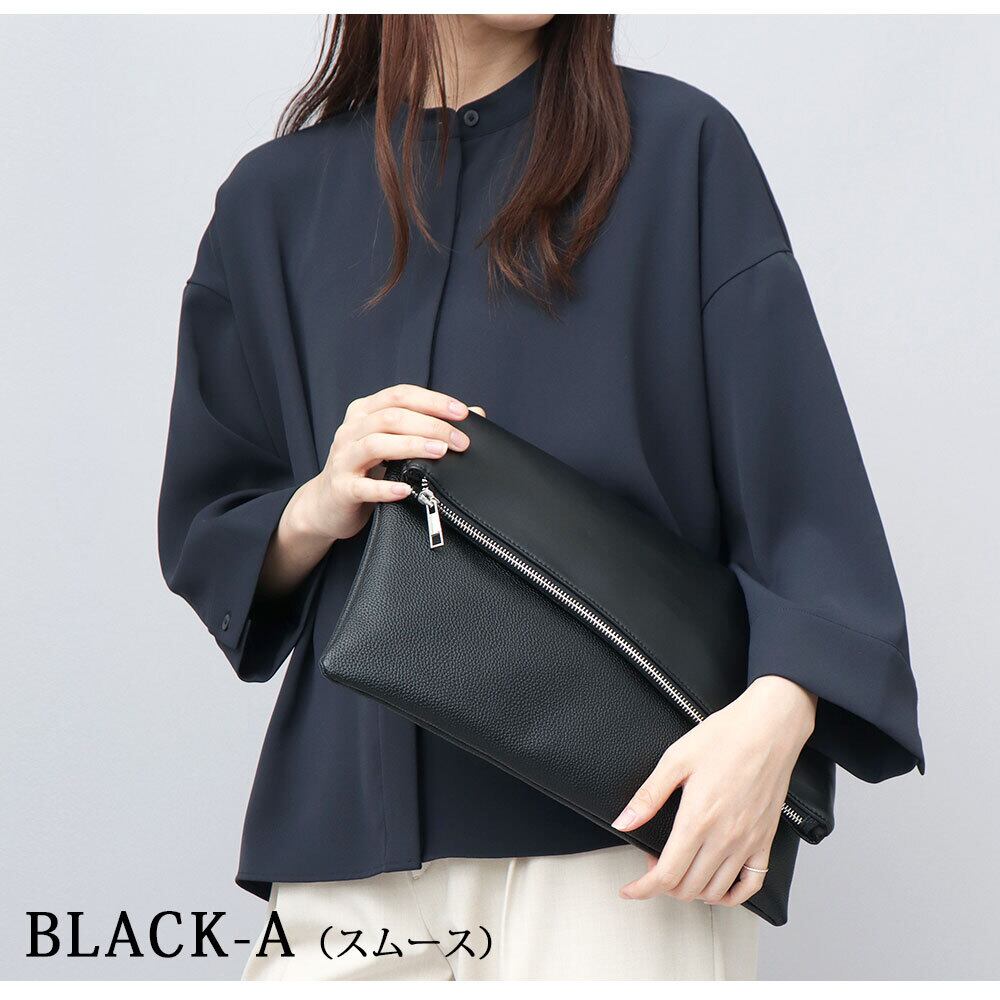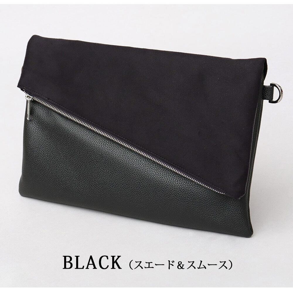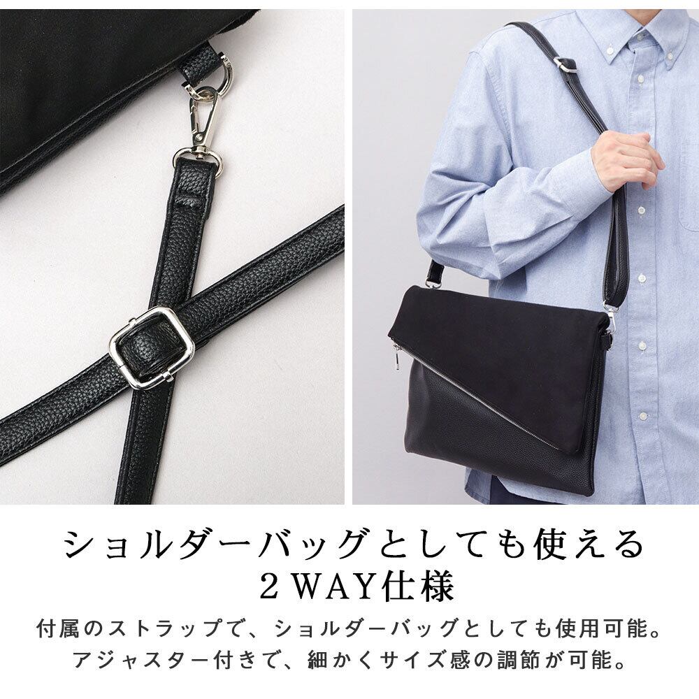 斜めに切り替えられたフラップデザインが、モードな雰囲気のクラッチバッグ。程よい艶感のレザー調素材のボディに、異素材のフラップを合わせた、一癖あるデザイン。フラップ部分は、マットな質感のピーチスキン素材と、滑らかな質感のスムース素材の選べる2種類。斜めに切り替えたフラップデザインとメタルジップが、リッチな素材を引き立て、モードな雰囲気に。クラッチバッグとしては珍しい、A4が収まるやや大きめのサイズ感。付属のショルダーストラップは、ボディの同素材を贅沢に使用。普段のカジュアルスタイルからキレイめスタイルまで幅広く合わせられるクラッチバッグ。
