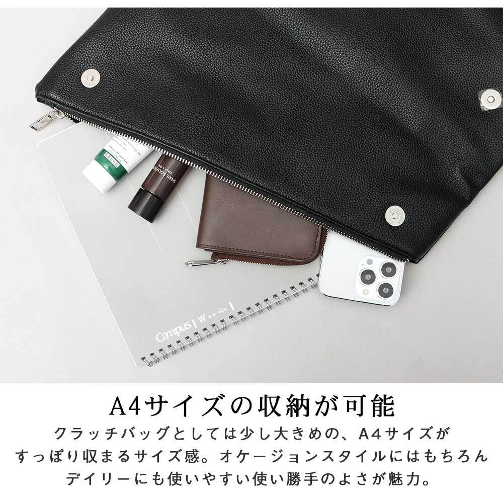 クラッチバッグとしては少し大きめの、A4サイズがすっぽり収まるサイズ感。オケージョンスタイルにはもちろん、デイリーにも使いやすい、使い勝手のよさが魅力。
