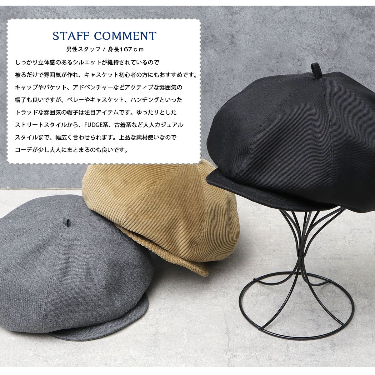 しっかりとしたハリ感のある素材が、キャスケットらしいボリュームあるシルエットをキープして被ることができます。カジュアルな印象のキャスケットですが、上品な印象の素材使いで、マニッシュなキレイめコーデや、レザーなどを合わせた甘辛なスタイルにもオススメ。深く被ったり浅く被ったりとボリューム感で遊べます。