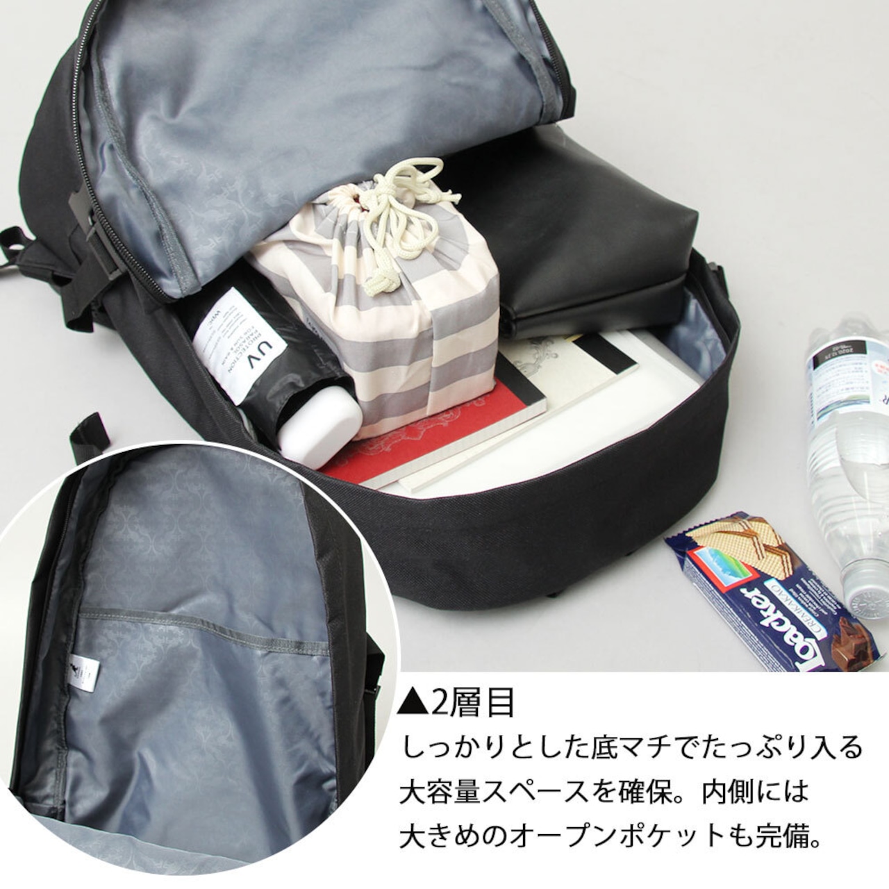 しっかりとした底マチでたっぷり入る大容量スペースを確保。内側には大きめのオープンポケットも完備。