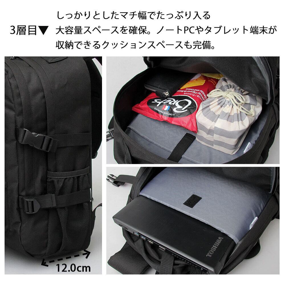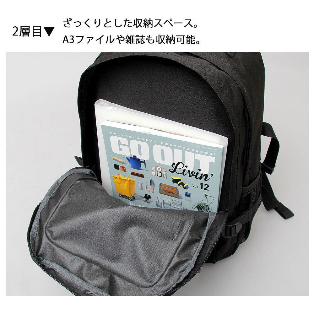 メイン収納部は用途に合わせて使い分けができる3層式構造。