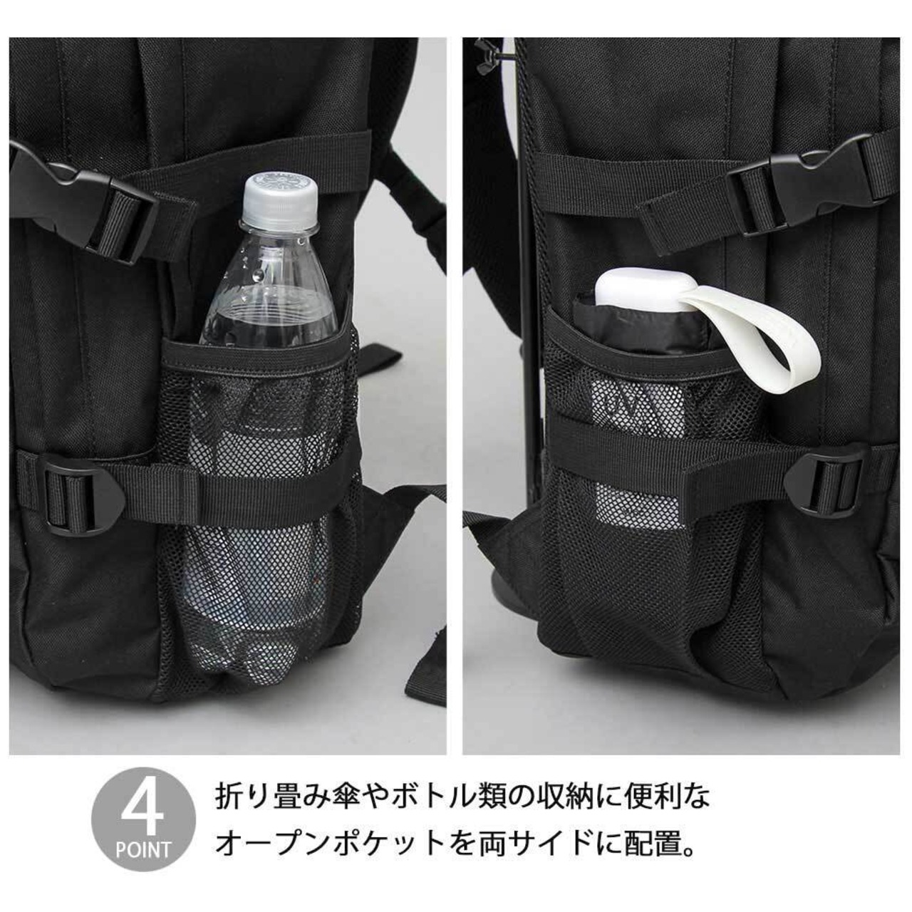 折り畳み傘やボトル類の収納に便利なオープンポケットを両サイドに配置。