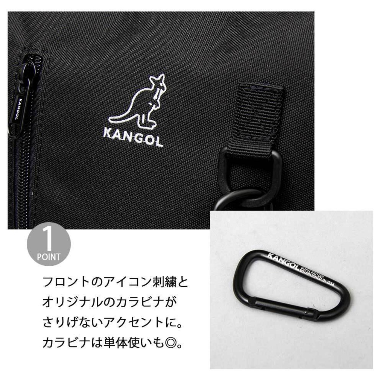 フロントのアイコン刺繍とオリジナルのカラビナがさりげないアクセントに。カラビナは単体使いも◎。