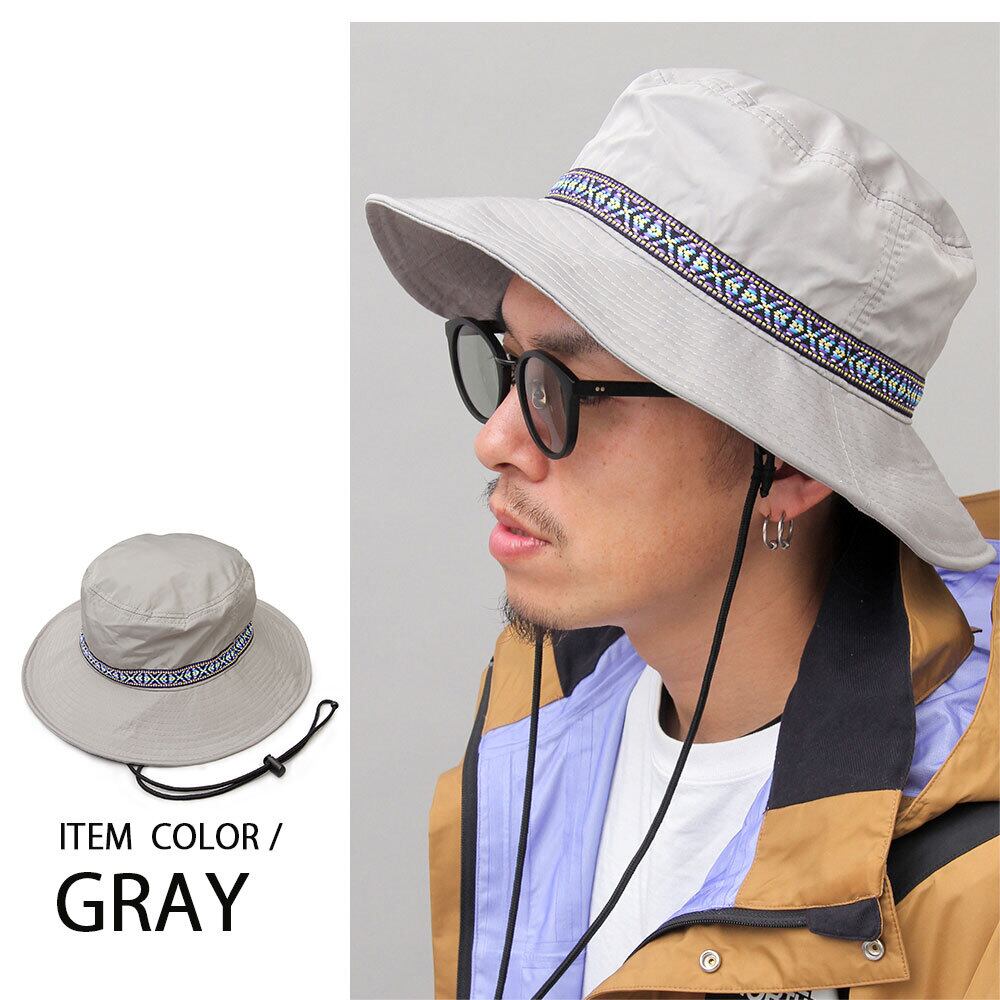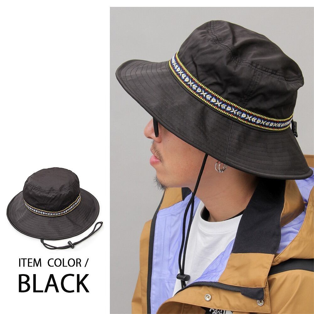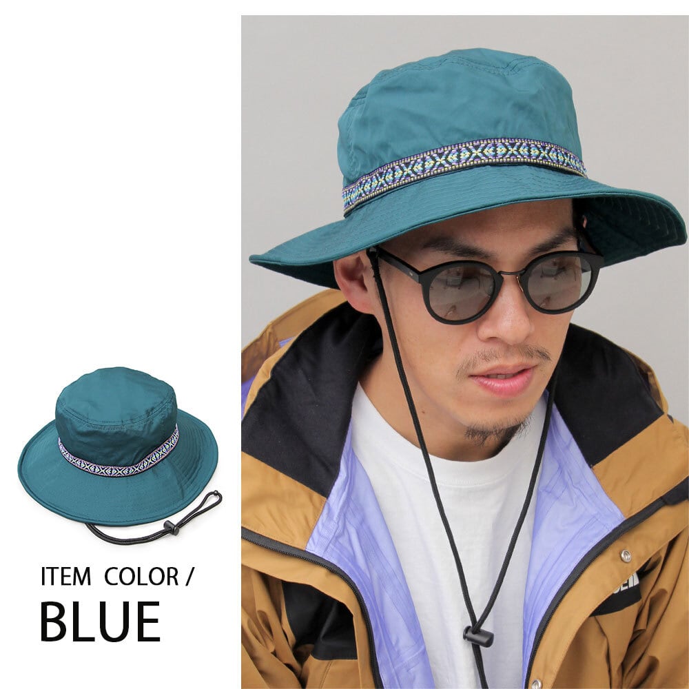 クラウン部分に巻いたチロリアンテープがアクセントに。エスニックなデザインがアウトドアな雰囲気をプラス。