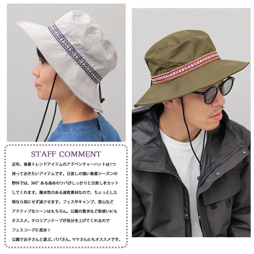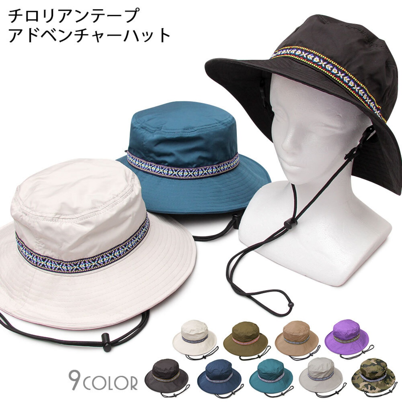 日除けに適した360度の長めのツバ、フィット感を調節できるあご紐、速乾性に優れたポリエステル素材など、春夏シーズンのマストアイテム“アドベンチャーハット(サファリハット)”。表面に撥水加工を施したポリエステル生地は、水をかけても玉になりしっかり水を弾いてくれて、汚れにくいのもポイント。クラウン部分に巻いたチロリアンテープがアクセント。手軽にアウトドアテイストを楽しめます。フェス!遊びに!アウトドアに!春夏のアクティブシーンオススメ。