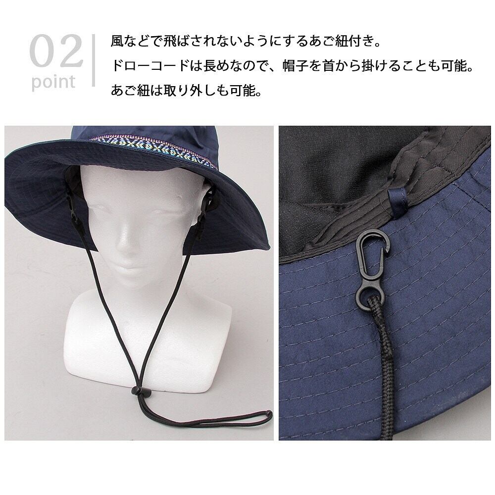 風などで飛ばされないようにするあご紐付き。ドローコードは長めなので、帽子を首から掛けることも可能。あご紐は取り外しも可能。