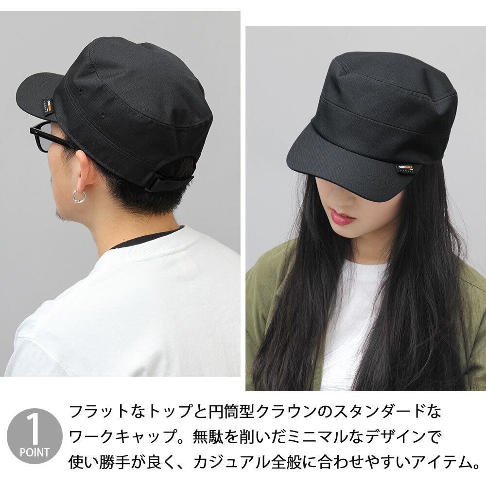 フラットなトップと円筒型クラウンのスタンダードなワークキャップ。無駄を削いだミニマルなデザインで使い勝手が良く、カジュアル全般に合わせやすいアイテム。