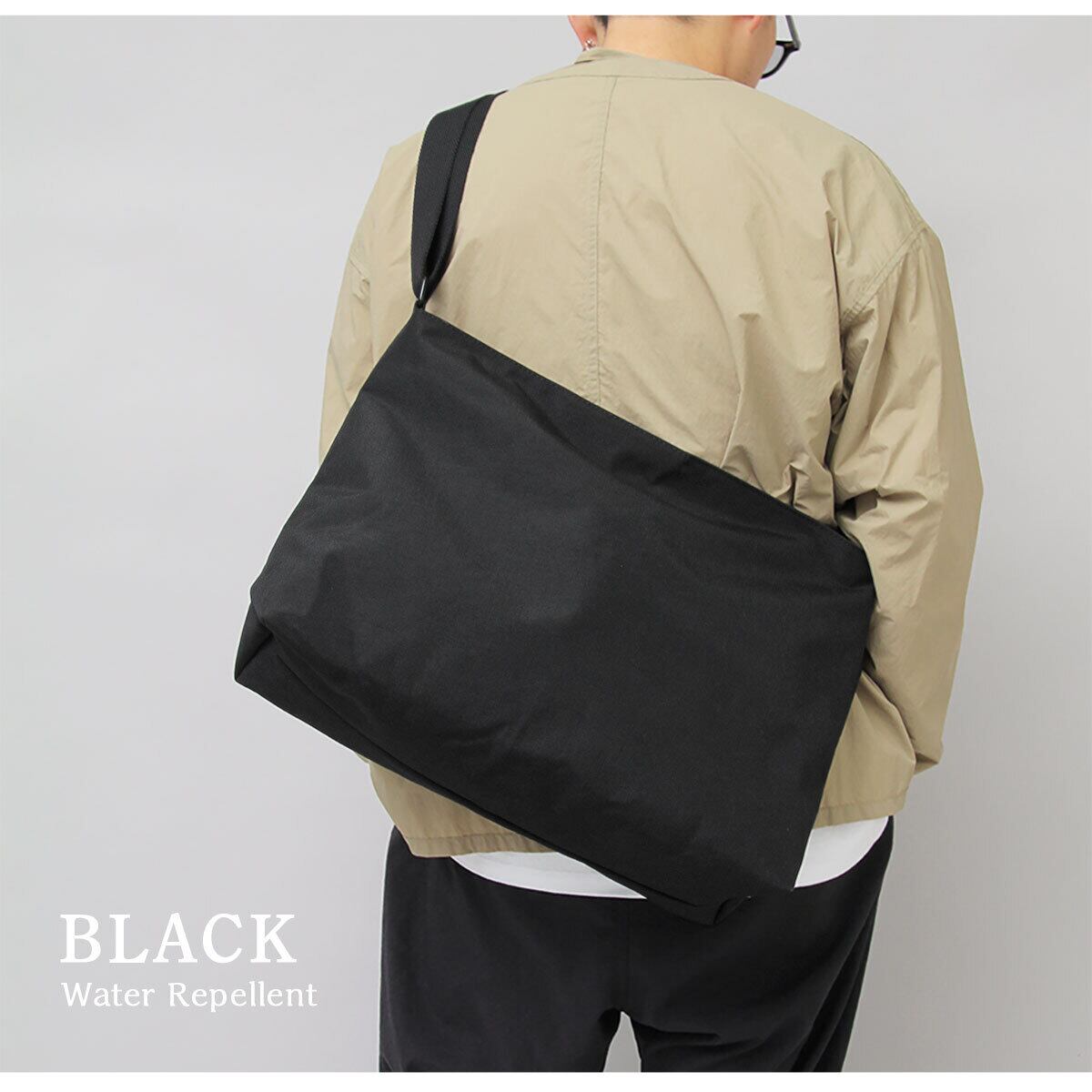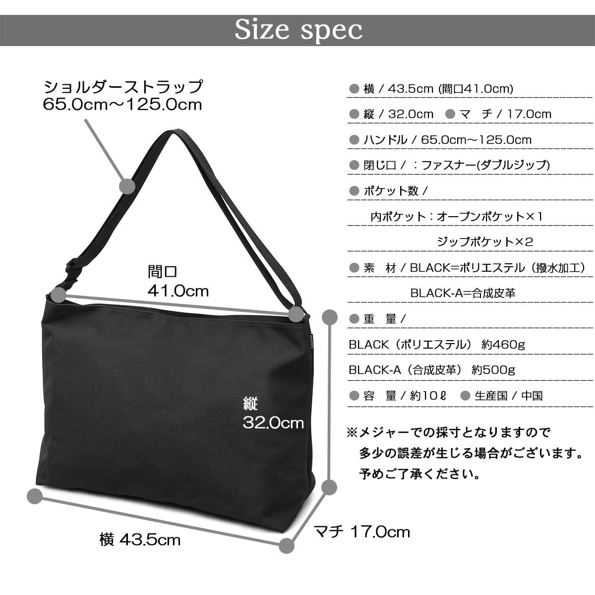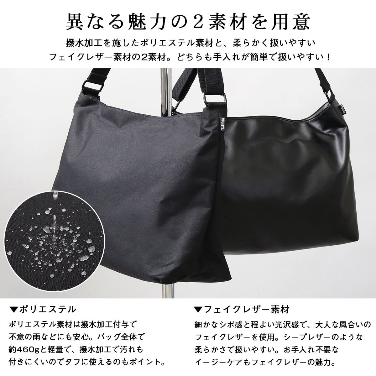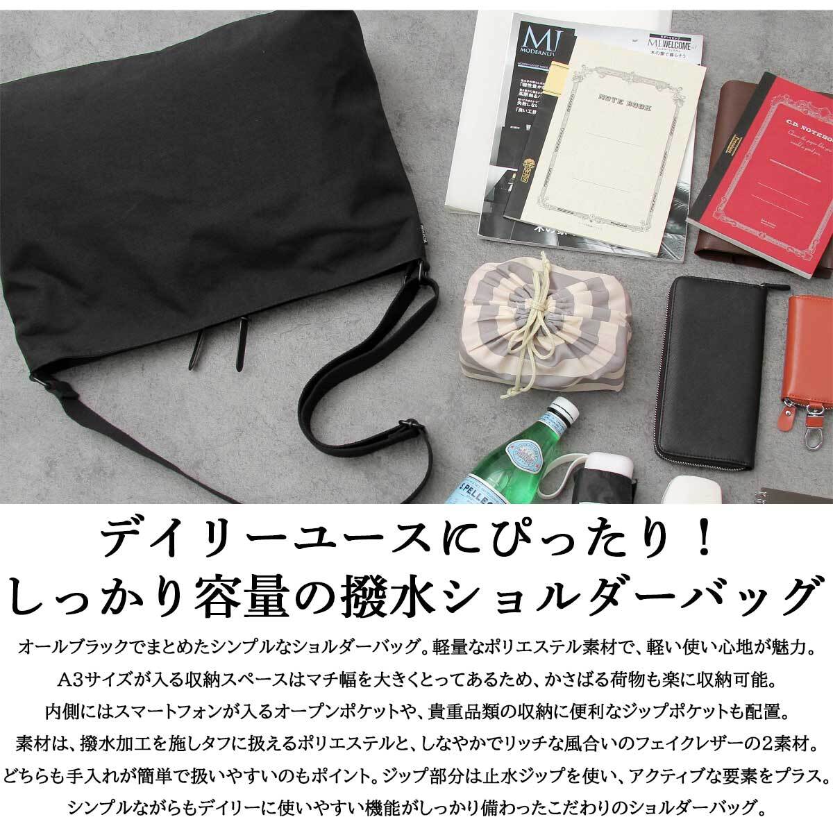 オールブラックでまとめたシンプルなショルダーバッグ。軽量なポリエステル素材で、軽い使い心地が魅力。A3サイズが入る収納スペースはマチ幅を大きくとってあるため、かさばる荷物も楽に収納可能。内側にはスマートフォンが入るオープンポケットや、貴重品類の収納に便利なジップポケットも配置。素材は、撥水加工を施しタフに扱えるポリエステルと、しなやかでリッチな風合いのフェイクレザーの2素材。どちらも手入れが簡単で扱いやすいのもポイント。ジップ部分は止水ジップを使い、アクティブな要素をプラス。シンプルながらもデイリーに使いやすい機能がしっかり備わったこだわりのショルダーバッグ。