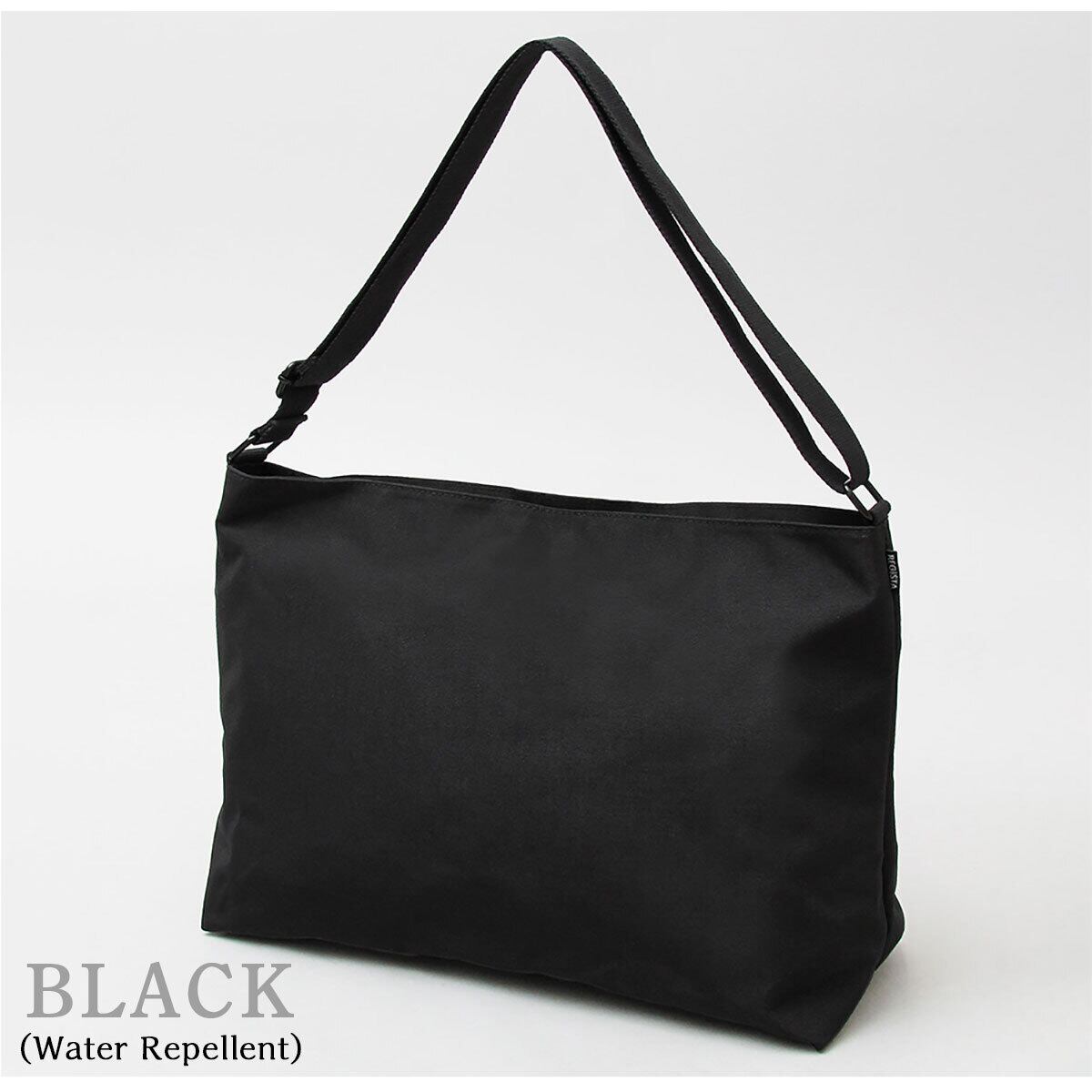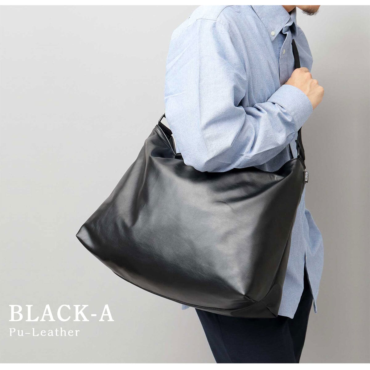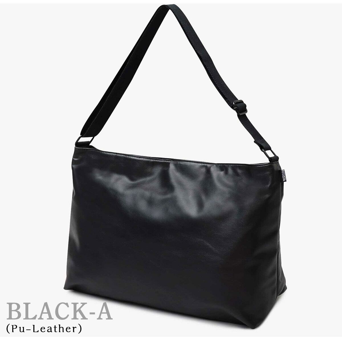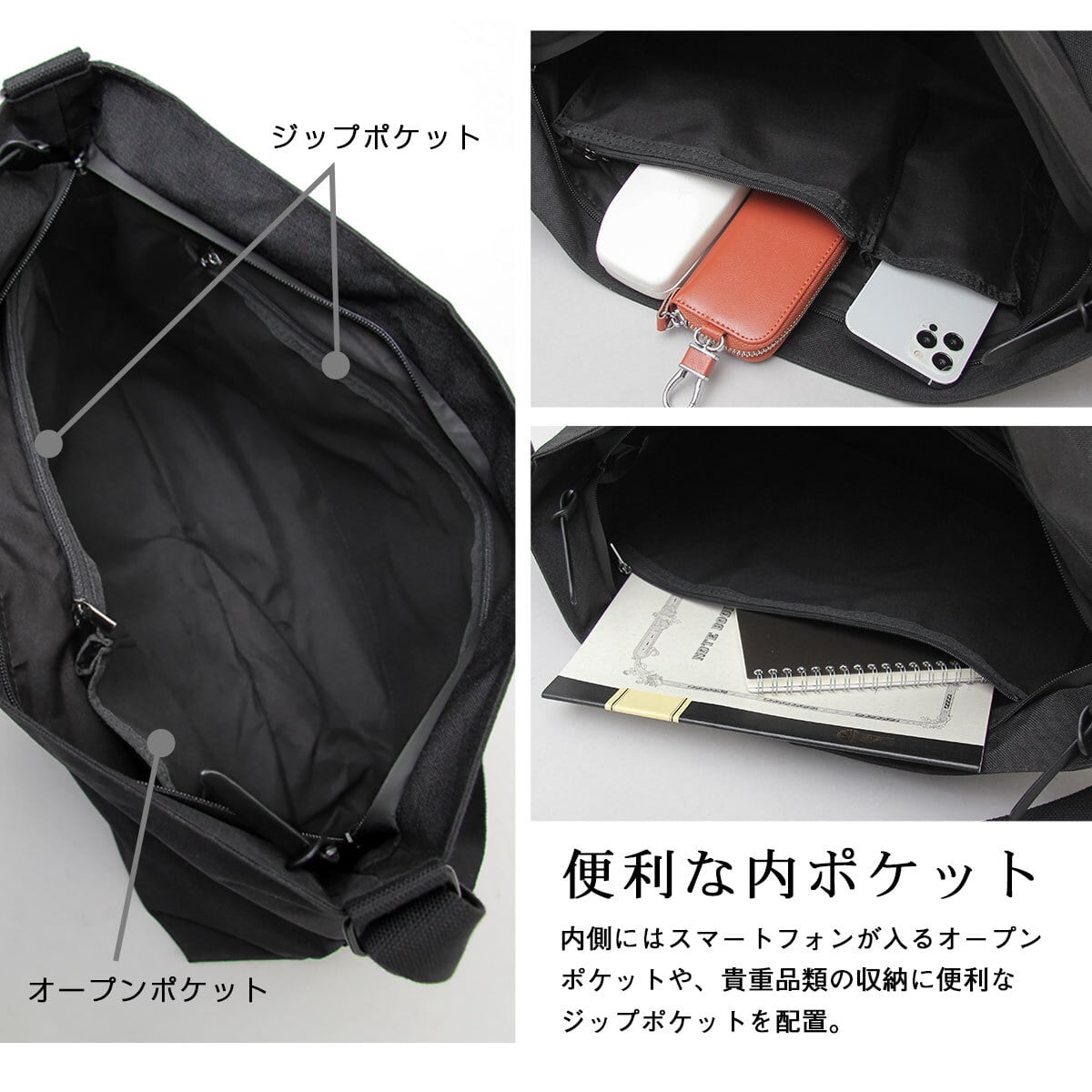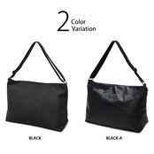 オールブラックでまとめたシンプルなショルダーバッグ。軽量なポリエステル素材で、軽い使い心地が魅力。A3サイズが入る収納スペースはマチ幅を大きくとってあるため、かさばる荷物も楽に収納可能。内側にはスマートフォンが入るオープンポケットや、貴重品類の収納に便利なジップポケットも配置。素材は、撥水加工を施しタフに扱えるポリエステルと、しなやかでリッチな風合いのフェイクレザーの2素材。どちらも手入れが簡単で扱いやすいのもポイント。ジップ部分は止水ジップを使い、アクティブな要素をプラス。シンプルながらもデイリーに使いやすい機能がしっかり備わったこだわりのショルダーバッグ。