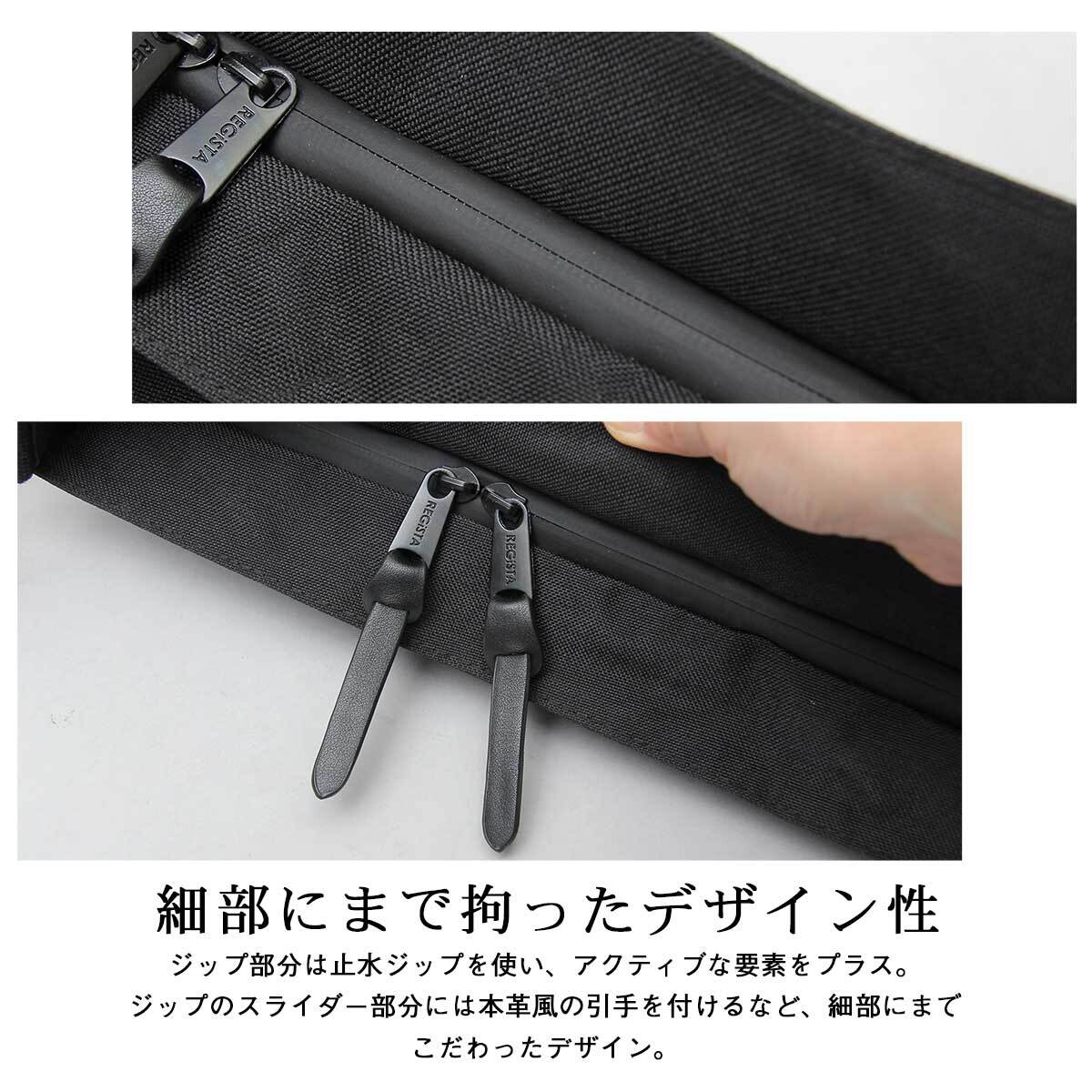 A3サイズが入る少し大きめのサイズですが、とても軽い使い心地です。止水ジップを使用したり金具部分もブラックにまとめていたりと、細部にもこだわりを感じられるデザインです。撥水加工がされているのもポイントで、不意な雨などの際にも安心の仕様です。