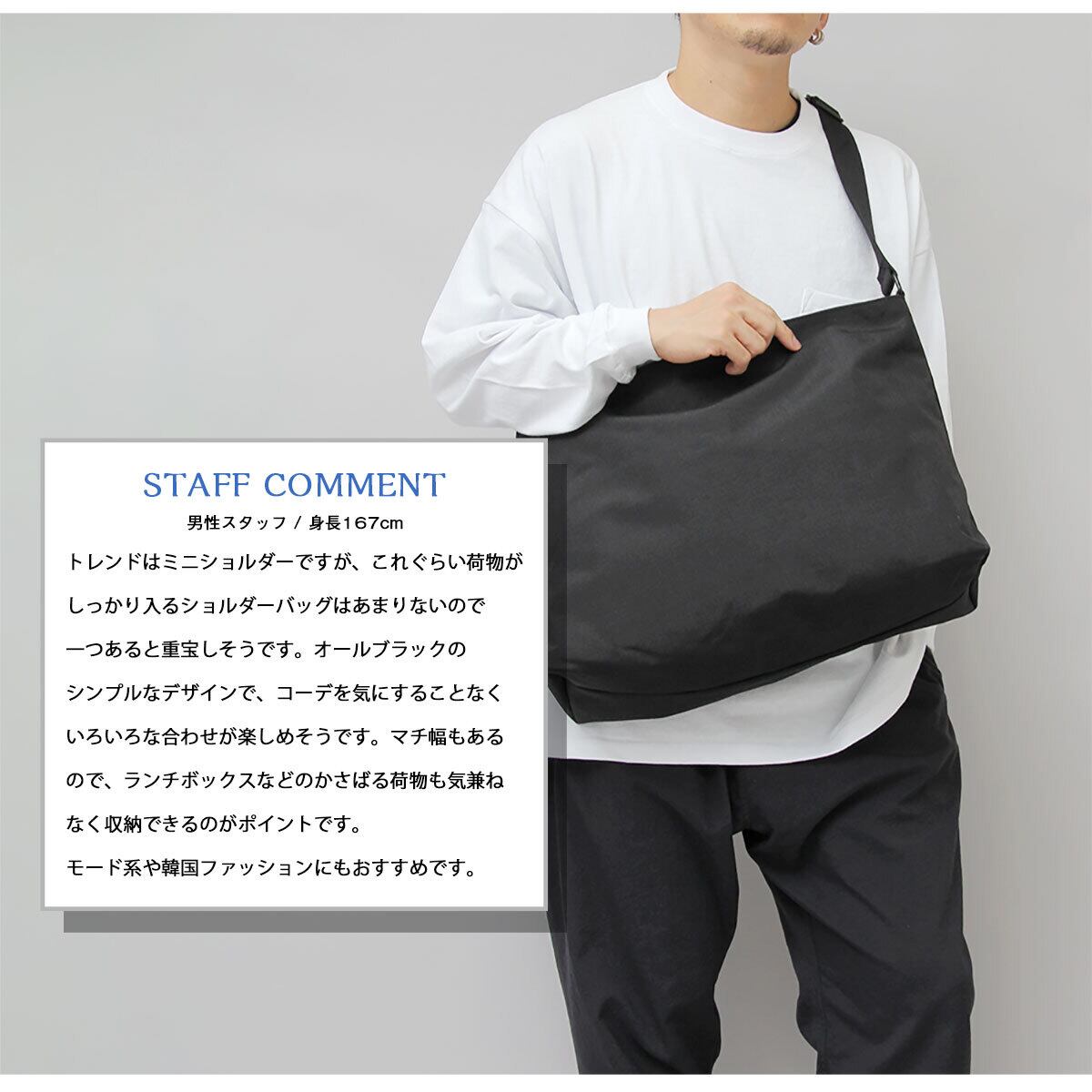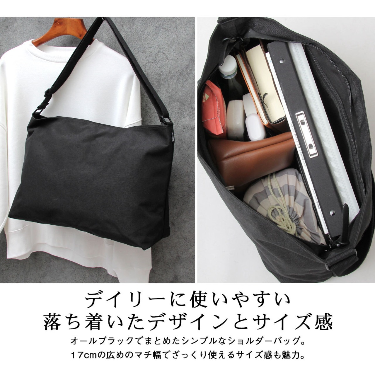 オールブラックでまとめたシンプルなショルダーバッグ。17cmの広めのマチ幅でざっくり使えるサイズ感も魅力。