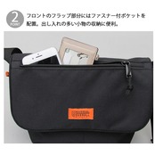 フロントのフラップ部分にはファスナー付ポケットを配置。出し入れの多い小物の収納に便利。