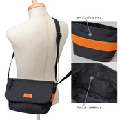 フラップタイプのシンプルなミニメッセンジャーに、ブランドカラーであるオレンジのブランドネームタグとフラップテープがアクセントになったデザイン。
