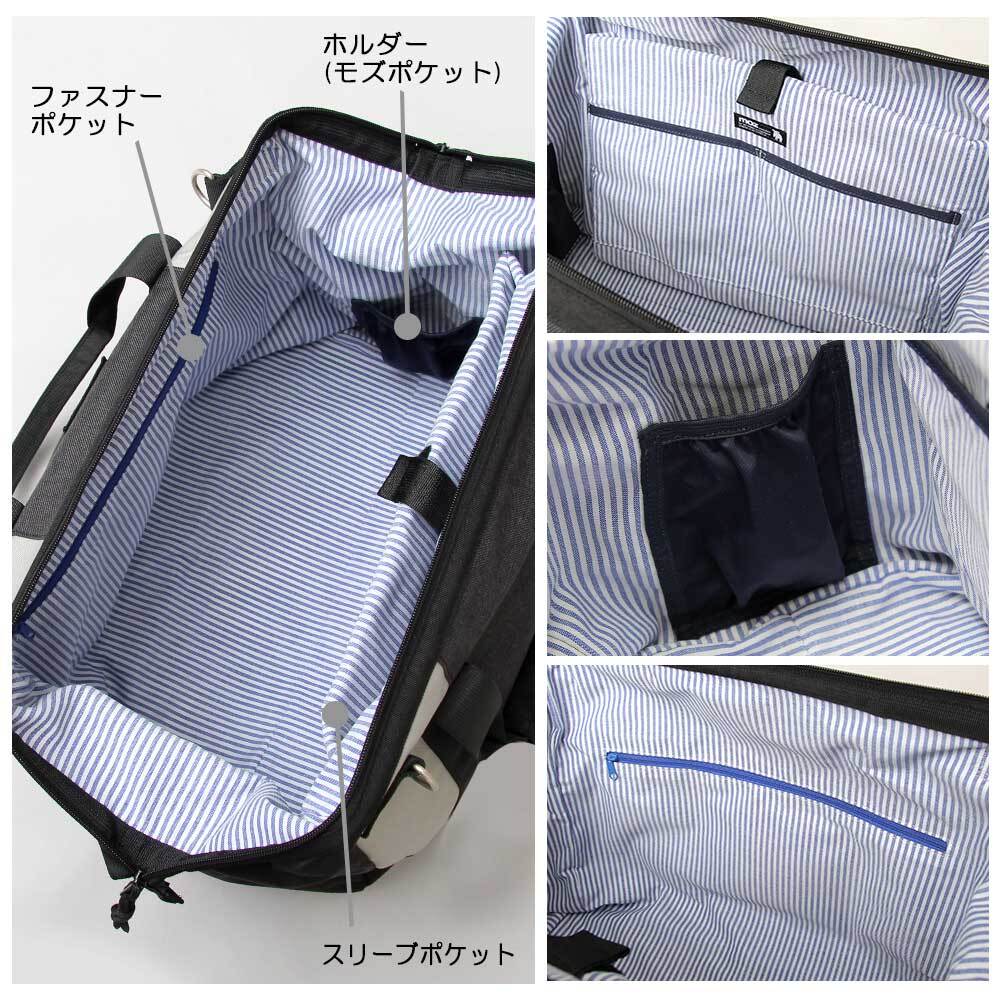 内側にはファスナーポケット、ノートPC対応のスリーブポケットなどデイリーでも使いしやすい仕様。伸縮性のある素材を使用したmozオリジナルの”モズポケット”も完備。