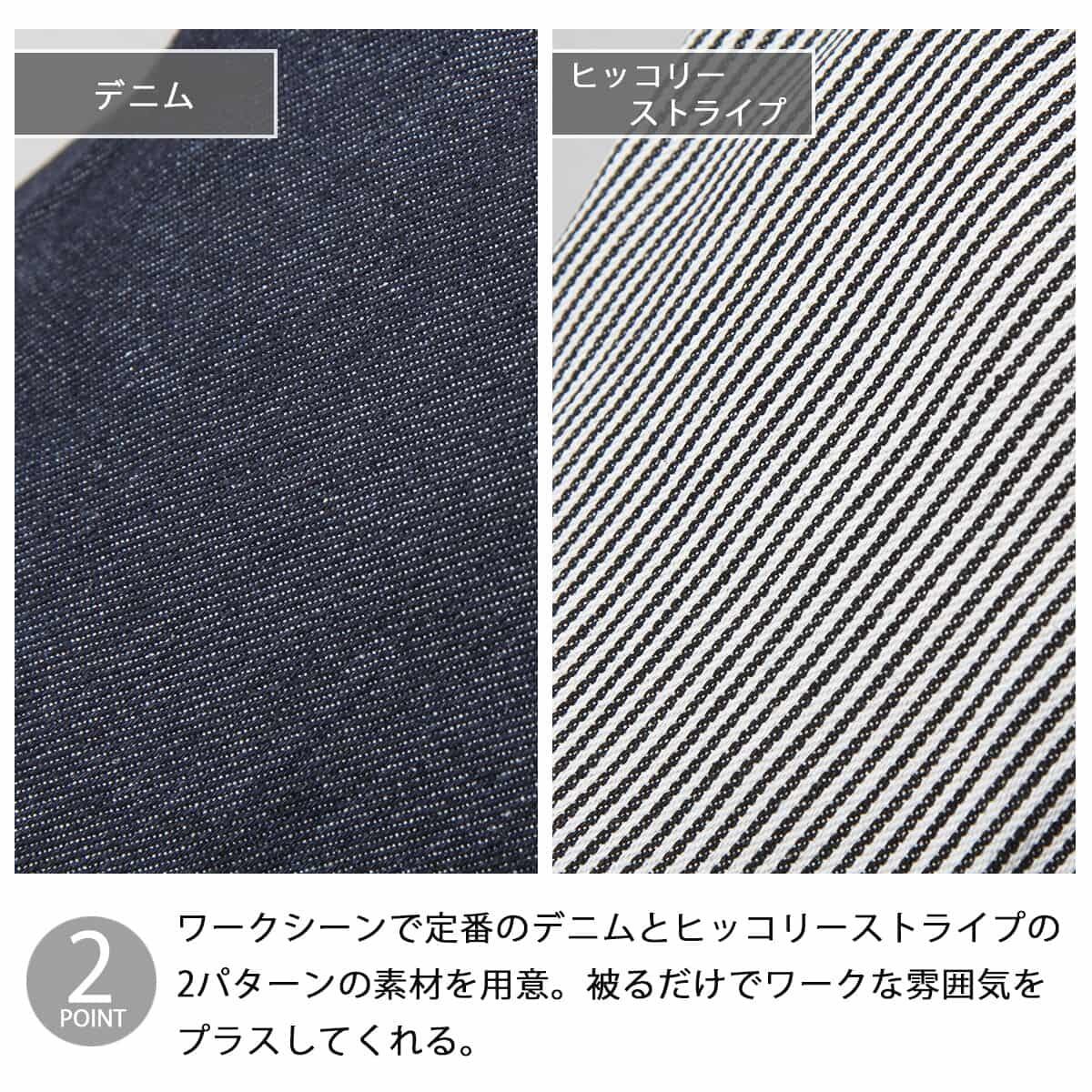 ワークシーンで定番のデニムとヒッコリーストライプの2パターンの素材を用意。被るだけでワークな雰囲気をプラスしてくれる。
