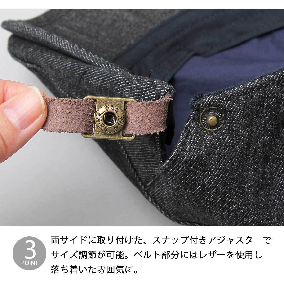 両サイドに取り付けた、スナップ付きアジャスターでサイズ調節が可能。ベルト部分にはレザーを使用し落ち着いた雰囲気に。
