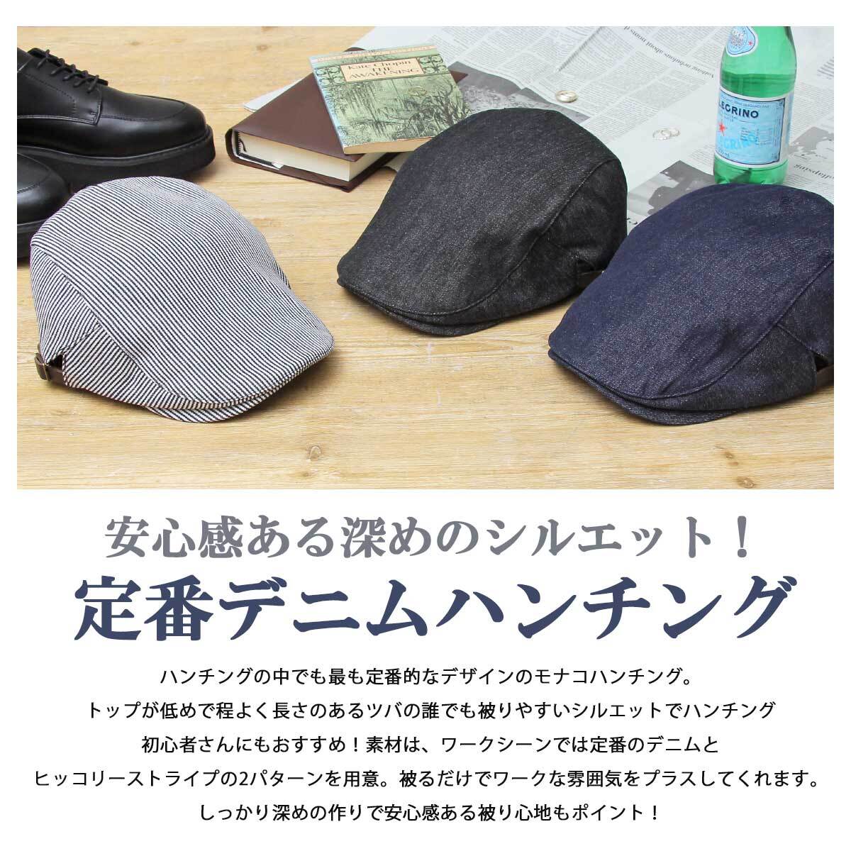 ハンチングの中でも最も定番的なデザインのモナコハンチング。トップが低めで程よく長さのあるツバの誰でも被りやすいシルエットでハンチング初心者さんにもおすすめ!素材は、ワークシーンでは定番のデニムとヒッコリーストライプの2パターンを用意。被るだけでワークな雰囲気をプラスしてくれます。しっかり深めの作りで安心感ある被り心地もポイント!