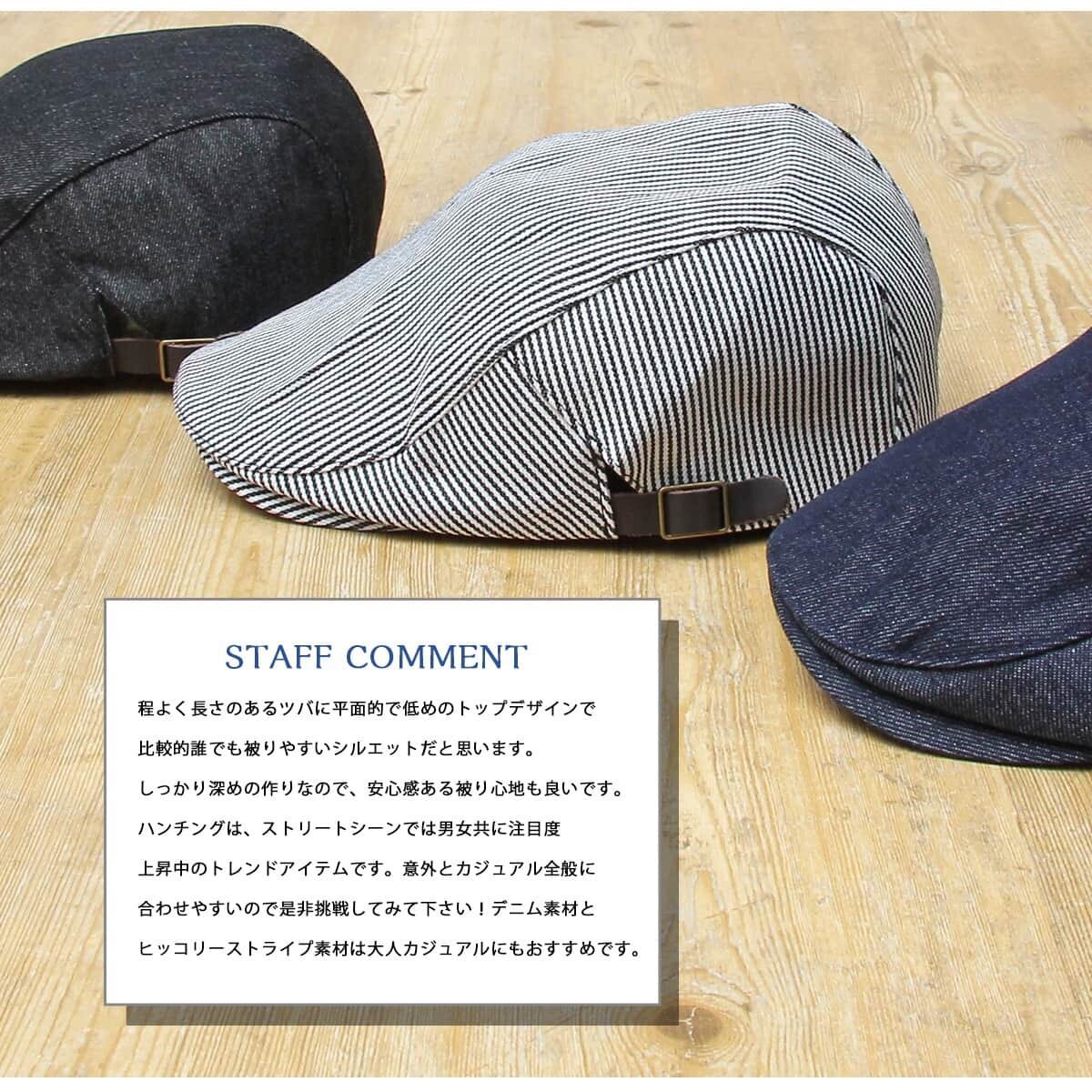 程よく長さのあるツバに平面的で低めのトップデザインで、比較的誰でも被りやすいシルエットだと思います。しっかり深めの作りなので、安心感ある被り心地も良いです。ハンチングは、ストリートシーンでは男女共に注目度上昇中のトレンドアイテムです。意外とカジュアル全般に合わせやすいので是非挑戦してみて下さい!デニム素材とヒッコリーストライプ素材は大人カジュアルにもおすすめです。