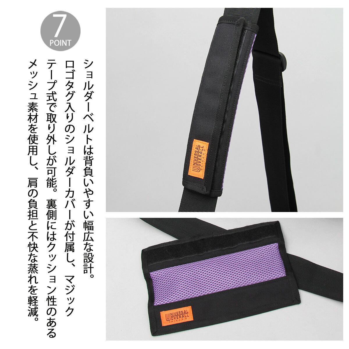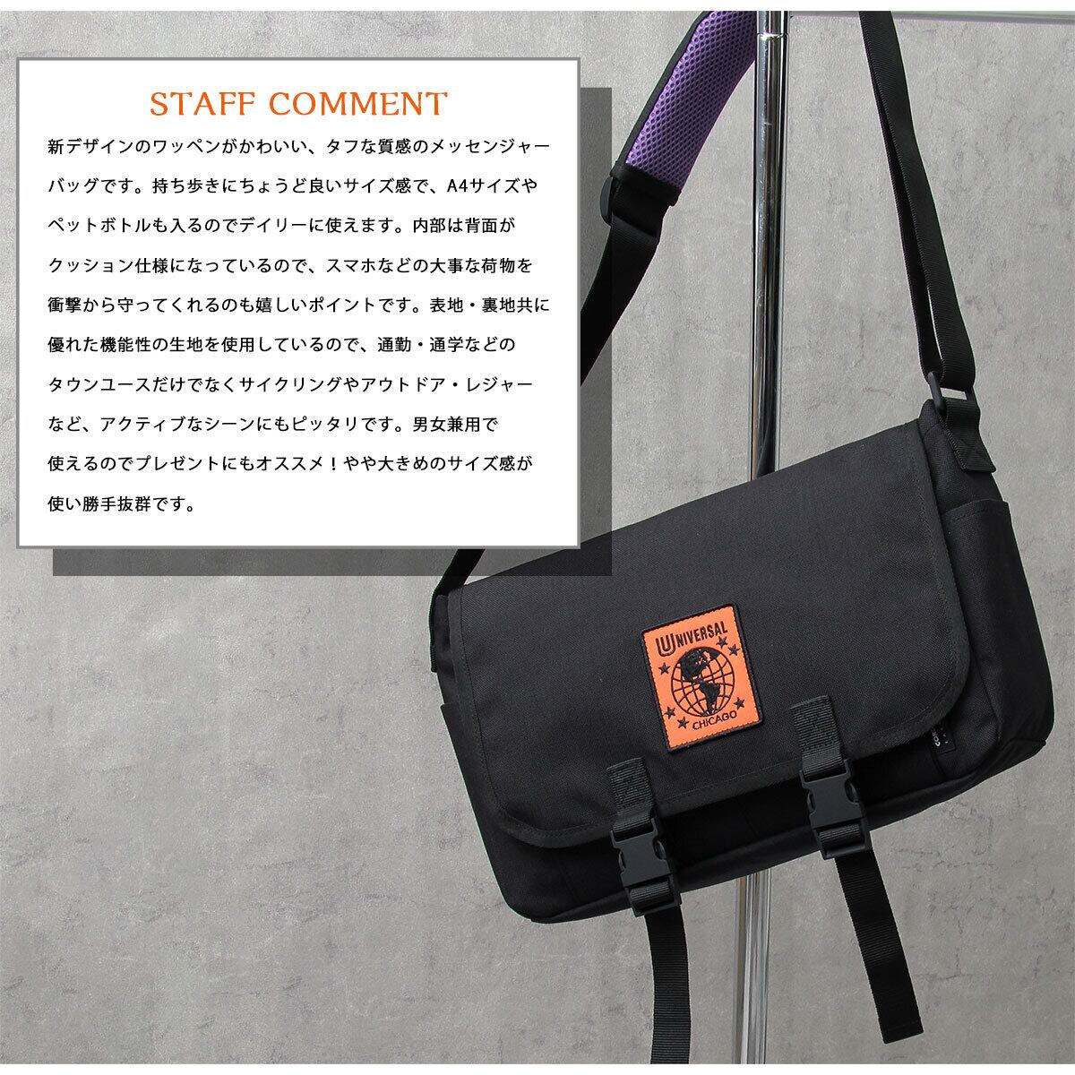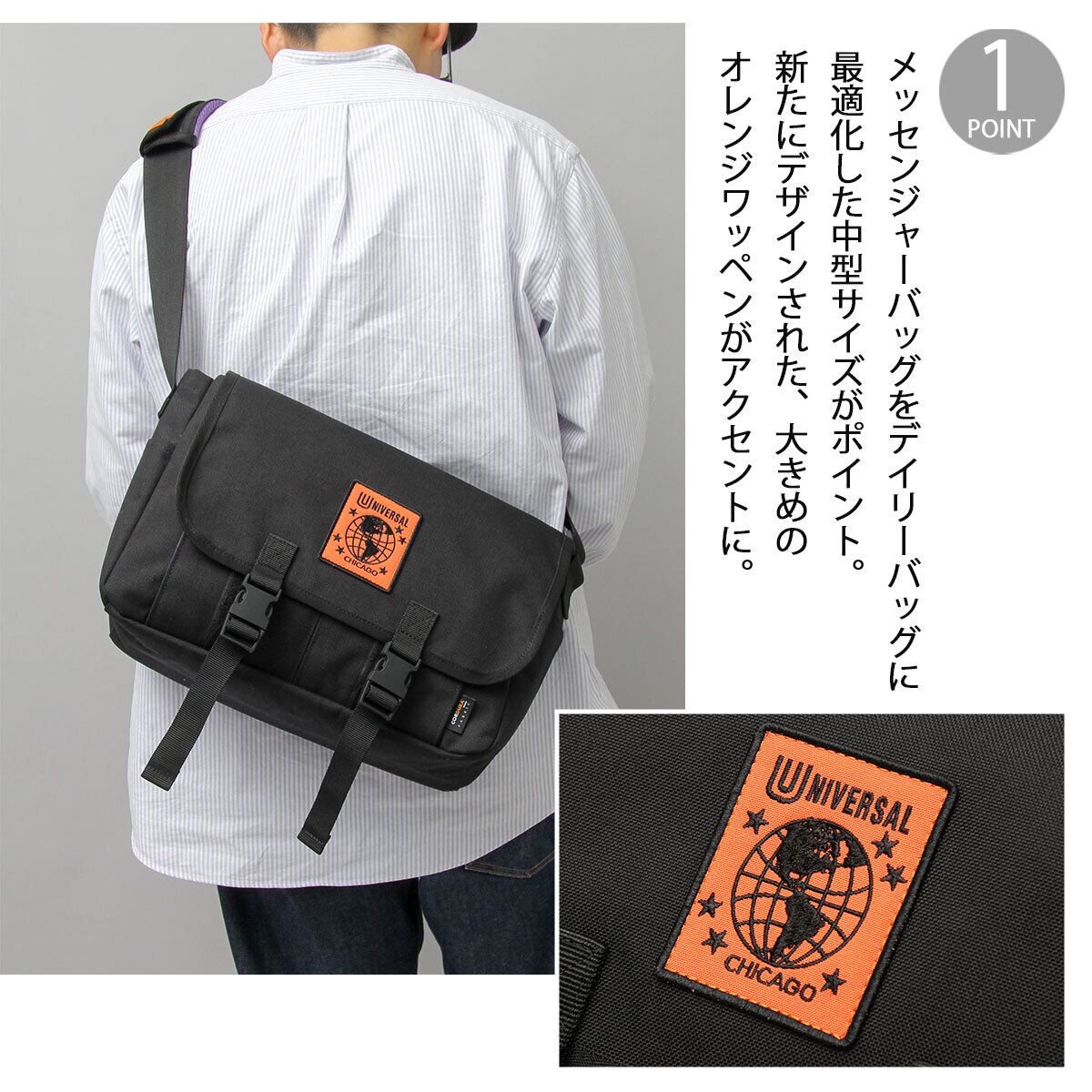老舗ワークウェアブランド“ユニバーサルオーバーオール”のメッセンジャーバッグ。新デザインのオレンジワッペンをワンポイントに施したシンプルなデザイン。メッセンジャーバッグをデイリーバッグに適用化した、使い勝手の良い中型サイズがポイント。裏地のターポリン生地との配色がクラシックでありながら新鮮な表情に。メインルームはA4サイズやペットボトルも楽々入る広々としたスペース。内部は背面がクッション仕様になっており、スマホやタブレットなどの電子機器や貴重品を衝撃から保護してくれるのも嬉しいポイント。小物の収納に便利なポケットを複数配置し、収納性も抜群。表地には長期的な耐久性に優れたCORDURAナイロン生地を使用。裏地には防汚性・耐水性に優れたターポリン生地を使用するなどワークブランドらしい丈夫な素材感にアップデート。タウンユースのみならず、アウトドアやサイクリング・レジャーなど、アクティブなシーンにも活躍間違いなしのアイテム。