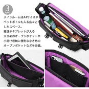 メインルームはA4サイズやペットボトルも入る広々としたスペース。雑誌やタブレットが入る大きめのオープンポケットや、小分け収納に便利な小さめのオープンポケットなどを完備。