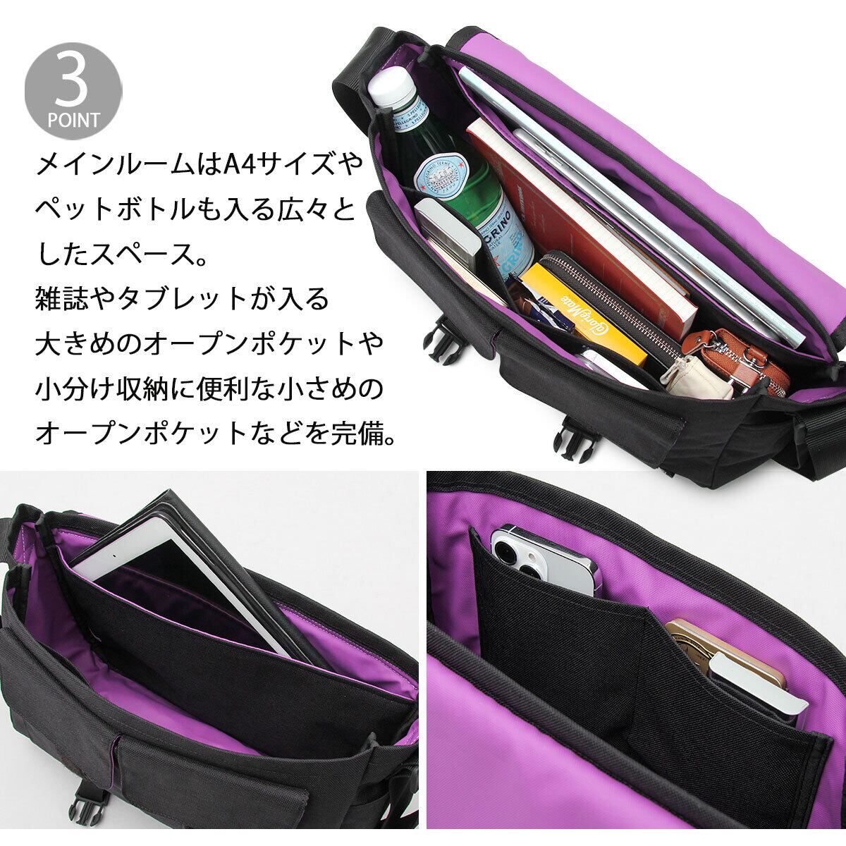 新デザインのワッペンがかわいい、タフな質感のメッセンジャーバッグです。持ち歩きにちょうど良いサイズ感で、A4サイズやペットボトルも入るのでデイリーに使えます。内部は背面がクッション仕様になっているので、スマホなどの大事な荷物を衝撃から守ってくれるのも嬉しいポイントです。表地・裏地共に優れた機能性の生地を使用しているので、通勤・通学などのタウンユースだけでなくサイクリングやアウトドア・レジャーなど、アクティブなシーンにもピッタリです。やや大きめのサイズ感が使い勝手抜群です。