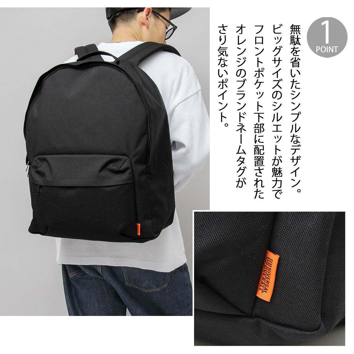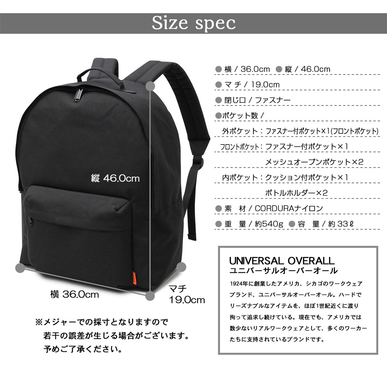 老舗ワークウェアブランド“ユニバーサルオーバーオール”のバックパック。無駄を削いだシンプルで、ビッグサイズのシルエットを主張したデザインが最大のポイント。素材には長期的な耐久性に優れたCORDURAナイロン生地を採用し、ワークブランドらしい丈夫な素材感にアップデート。メインルームはA3サイズも入る大容量スペースで、内部にはクッション仕様のオープンポケットや、ボトル類を倒さず仕舞えるホルダーなど実用性に優れた機能性も魅力。マチ付きのフロントポケット前面にはクッション材が入っているので、電子機器など衝撃からカバーできる作りに。通勤・通学などのデイリーユースはもちろん、旅行やアウトドア・レジャーなどのシーンにも活躍間違いなしのアイテム。