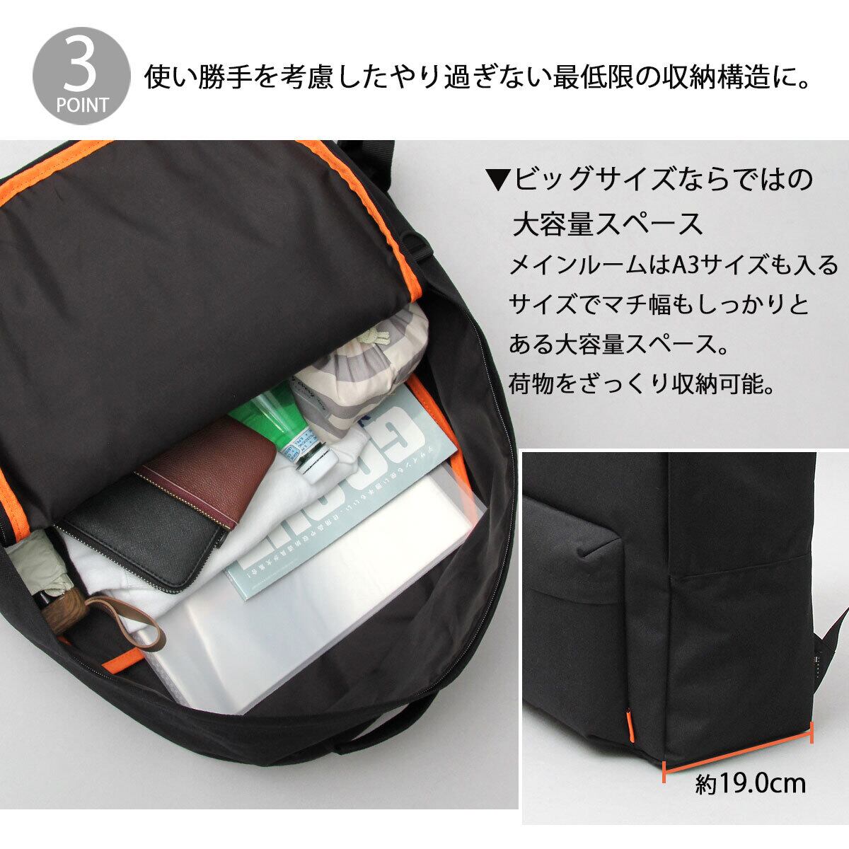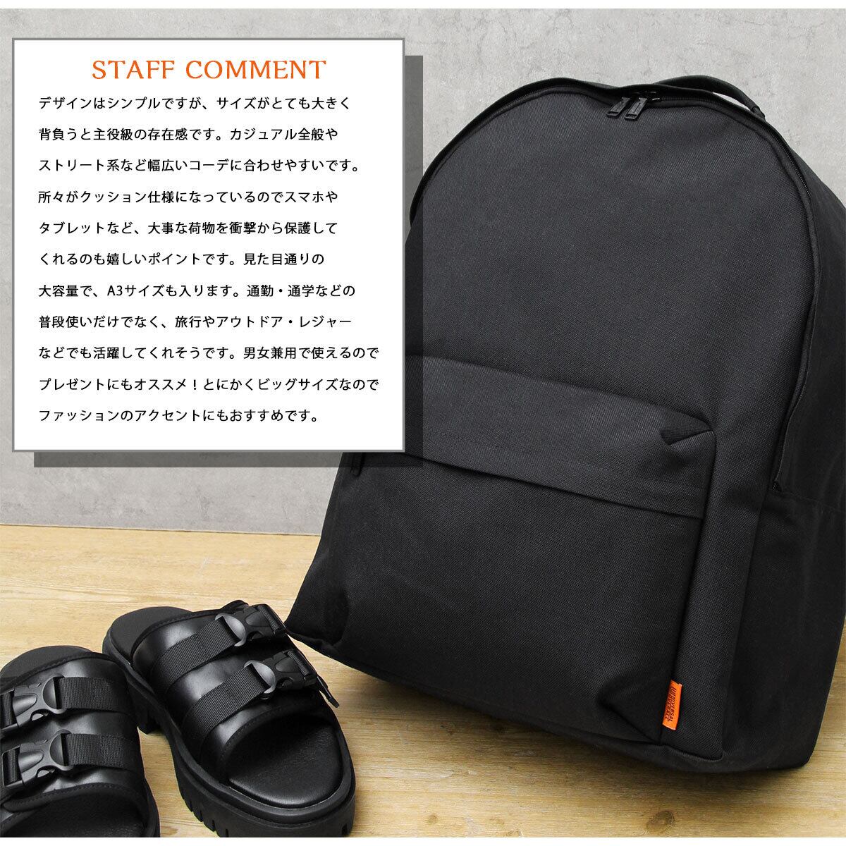 デザインはシンプルですが、サイズがとても大きく、背負うと主役級の存在感です。カジュアル全般やストリート系など幅広いコーデに合わせやすいです。所々がクッション仕様になっているのでスマホやタブレットなど、大事な荷物を衝撃から保護してくれるのも嬉しいポイントです。見た目通りの大容量で、A3サイズも入ります。通勤・通学などの普段使いだけでなく、旅行やアウトドア・レジャーなどでも活躍してくれそうです。男女兼用で使えるのでプレゼントにもオススメ!とにかくビッグサイズなので、ファッションのアクセントにもおすすめです。