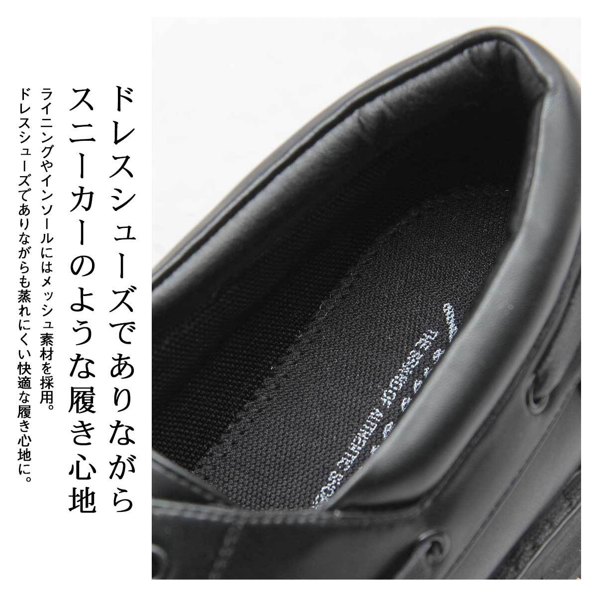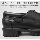 履き口をぐるりと囲むように配置したイミテーションレースと、甲部分をU字に縫ったモカシン縫いのアッパーなど、デッキシューズのディテールをオールブラックでモードにまとめたレースシューズ。つま先からしっかり立ち上がったラストを使用し、ソールには厚みのあるタンクソールを用いることで、程よいボリューム感のあるルックスに。ソールはEVA素材を挟むことで厚みを出しながらも重くなり過ぎないように配慮した作り。特徴的なデザインのサイドレース部分は床革(スプリットレザー)を使用し、高級感をプラス。ドレスシューズでありながら、内側素材を全てメッシュ素材にした、蒸れにくく柔らかな履き心地もポイント。