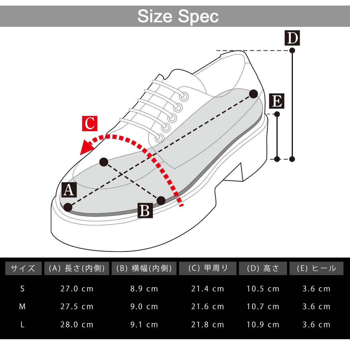 [S]長さ:27.0cm/ 幅:8.9cm/ 甲周り:21.4cm/ 高さ:10.5cm/ ヒール:3.6cm/