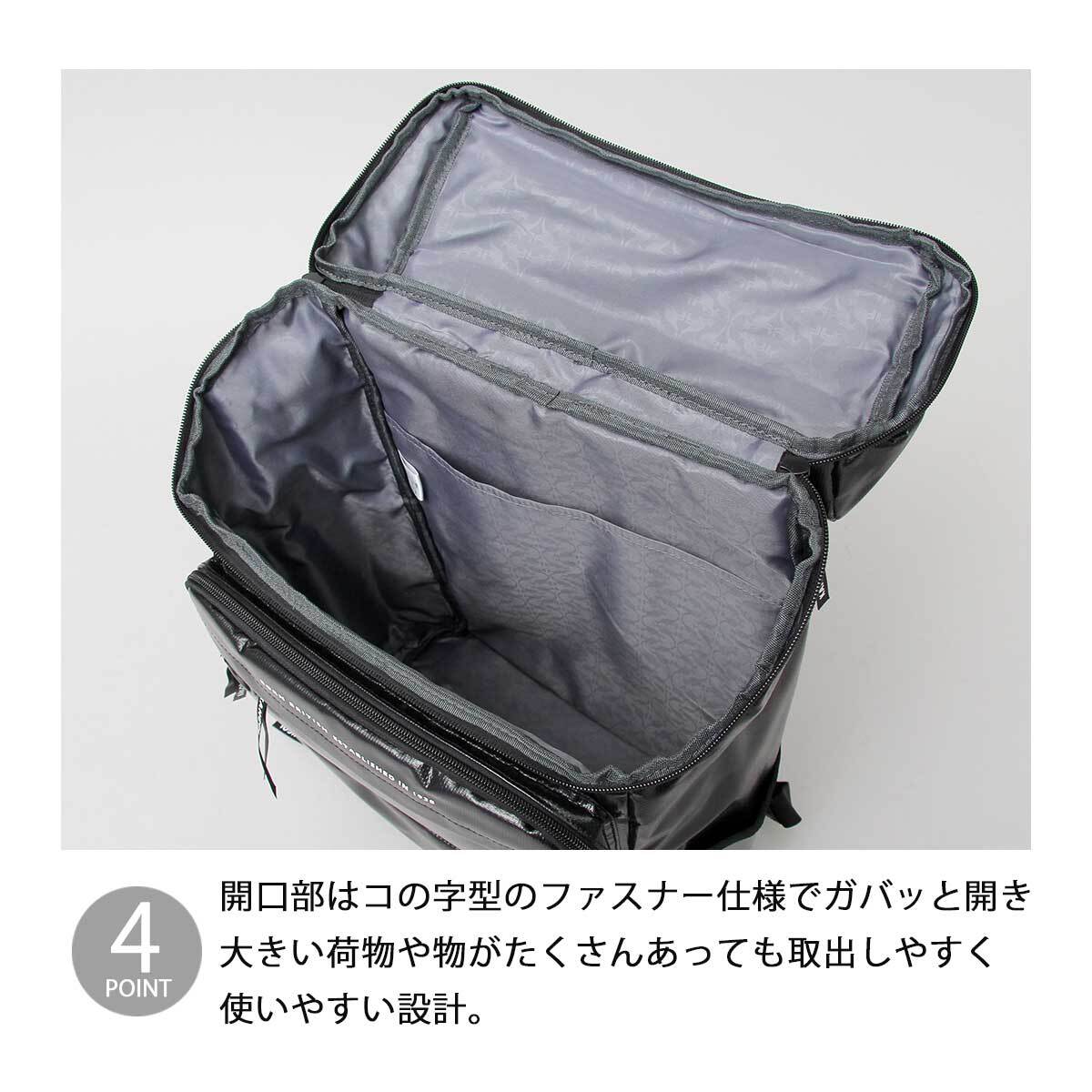 開口部はコの字型のファスナー仕様でガバッと開き、大きい荷物や物がたくさんあっても取出しやすく、使いやすい設計。