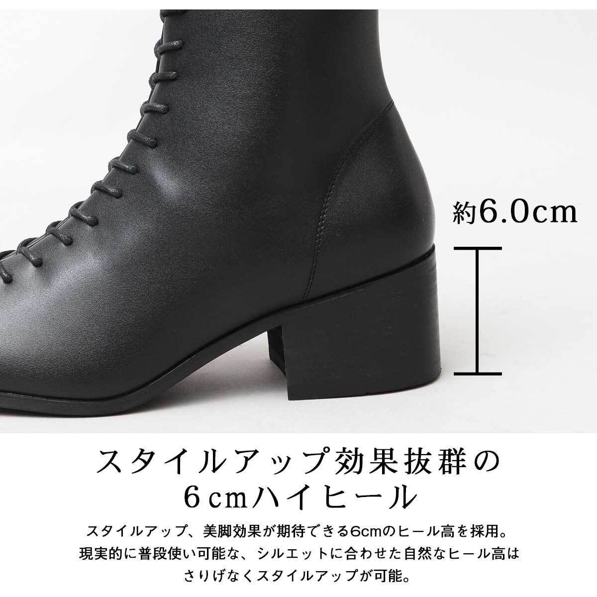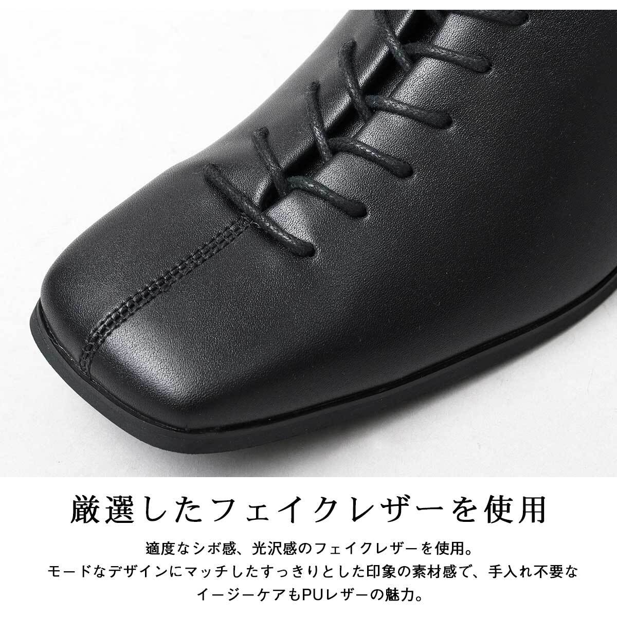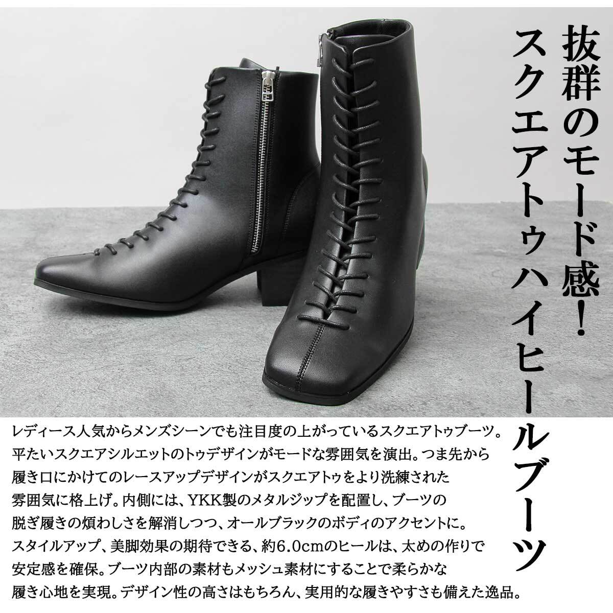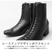レディース人気からメンズシーンでも注目度の上がっているスクエアトゥブーツ。平たいスクエアシルエットのトゥデザインがモードな雰囲気を演出。つま先から履き口にかけてのレースアップデザインがスクエアトゥをより洗練された雰囲気に格上げ。内側には、YKK製のメタルジップを配置し、ブーツの脱ぎ履きの煩わしさを解消しつつ、オールブラックのボディのアクセントに。スタイルアップ、美脚効果の期待できる、約6.0cmのヒールは、太めの作りで安定感を確保。ブーツ内部の素材もメッシュ素材にすることで柔らかな履き心地を実現。デザイン性の高さはもちろん、実用的な履きやすさも備えた逸品。