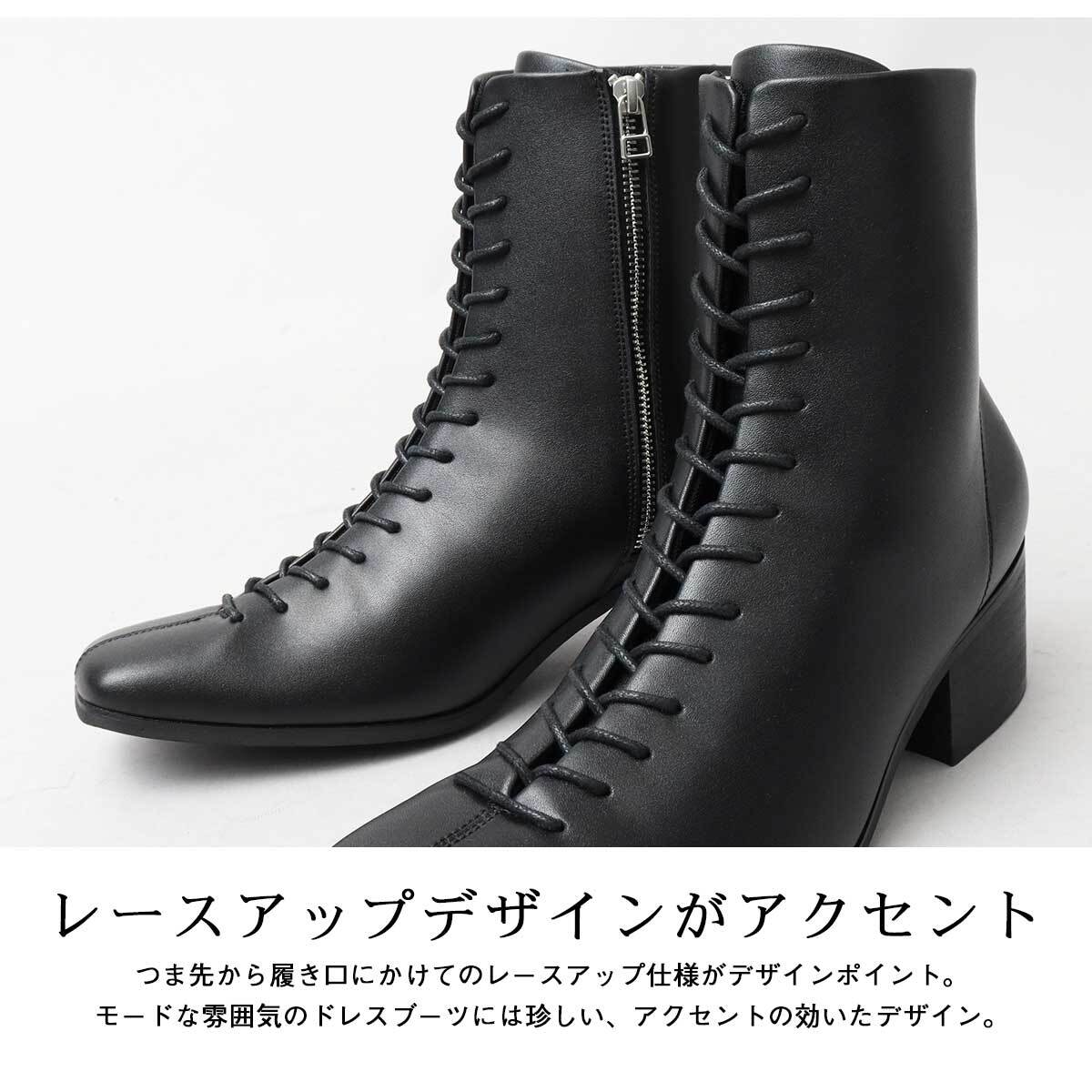 つま先から履き口にかけてのレースアップ仕様がデザインポイント。モードな雰囲気のドレスブーツには珍しい、アクセントの効いたデザイン。