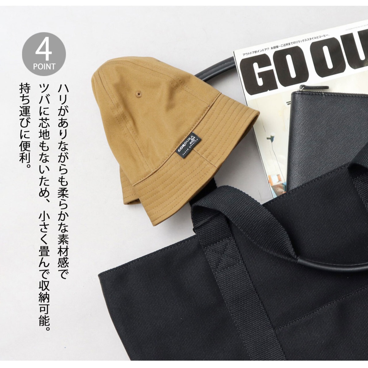 ハリがありながらも柔らかな素材感で、ツバに芯地もないので小さく畳んで収納可能。持ち運びに便利。