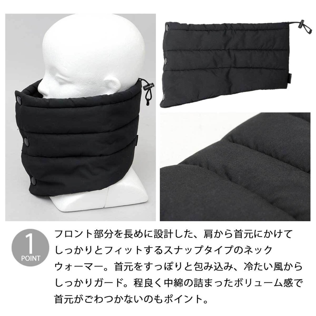 フロント部分を長めに設計した、肩から首元にかけてしっかりとフィットするスナップタイプのネックウォーマー。首元をすっぽりと包み込み、冷たい風からしっかりガード。程良く中綿の詰まったボリューム感で首元がごわつかないのもポイント。