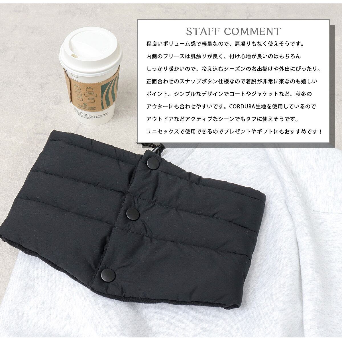 程良いボリューム感で軽量なので、肩凝りもなく使えそうです。内側のフリースは肌触りが良く、付け心地が良いのはもちろん、しっかり暖かいので、冷え込むシーズンのお出掛けや外出にぴったり。正面合わせのスナップボタン仕様なので着脱が非常に楽なのも嬉しいポイント。シンプルなデザインでコートやジャケットなど、秋冬のアウターにも合わせやすいです。CORDURA生地を使用しているので、アウトドアなどアクティブなシーンでもタフに使えそうです。ユニセックスで使用できるのでプレゼントやギフトにもおすすめです!