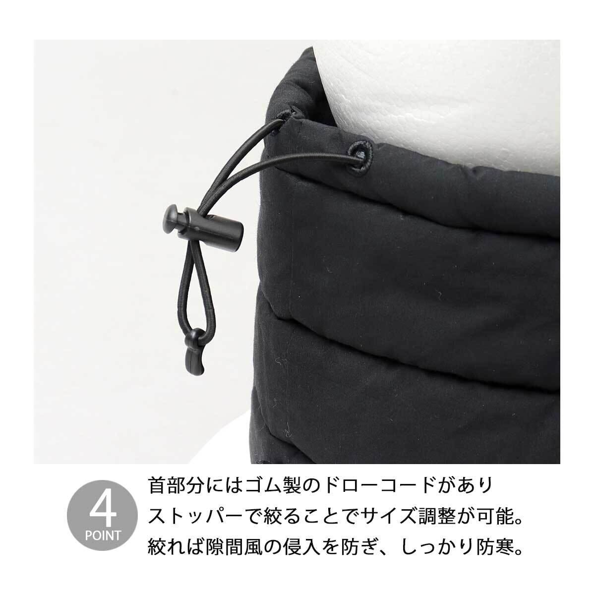 首部分にはゴム製のドローコードがあり、ストッパーで絞ることでサイズ調整が可能。絞れば隙間風の侵入を防ぎ、しっかり防寒。