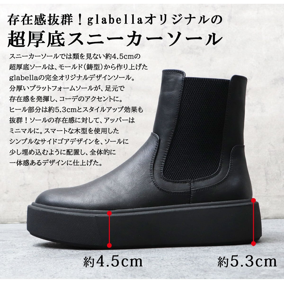 スニーカーソールでは類を見ない約4.5cmの超厚底ソールは、モールド(鋳型)から作り上げた、glabellaの完全オリジナルデザインソール。分厚いプラットフォームソールが、足元で存在感を発揮し、コーデのアクセントに。ヒール部分は約5.3cmとスタイルアップ効果も抜群!ソールの存在感に対して、アッパーはミニマルに。スマートな木型を使用した、シンプルなサイドゴアデザインを、ソールに少し埋め込むように配置し、全体的に一体感あるデザインに仕上げた。ライニングやインソールにメッシュ素材を使用したり、クッション性の高いインソールを採用したりと、実用性に配慮した作りもポイント。