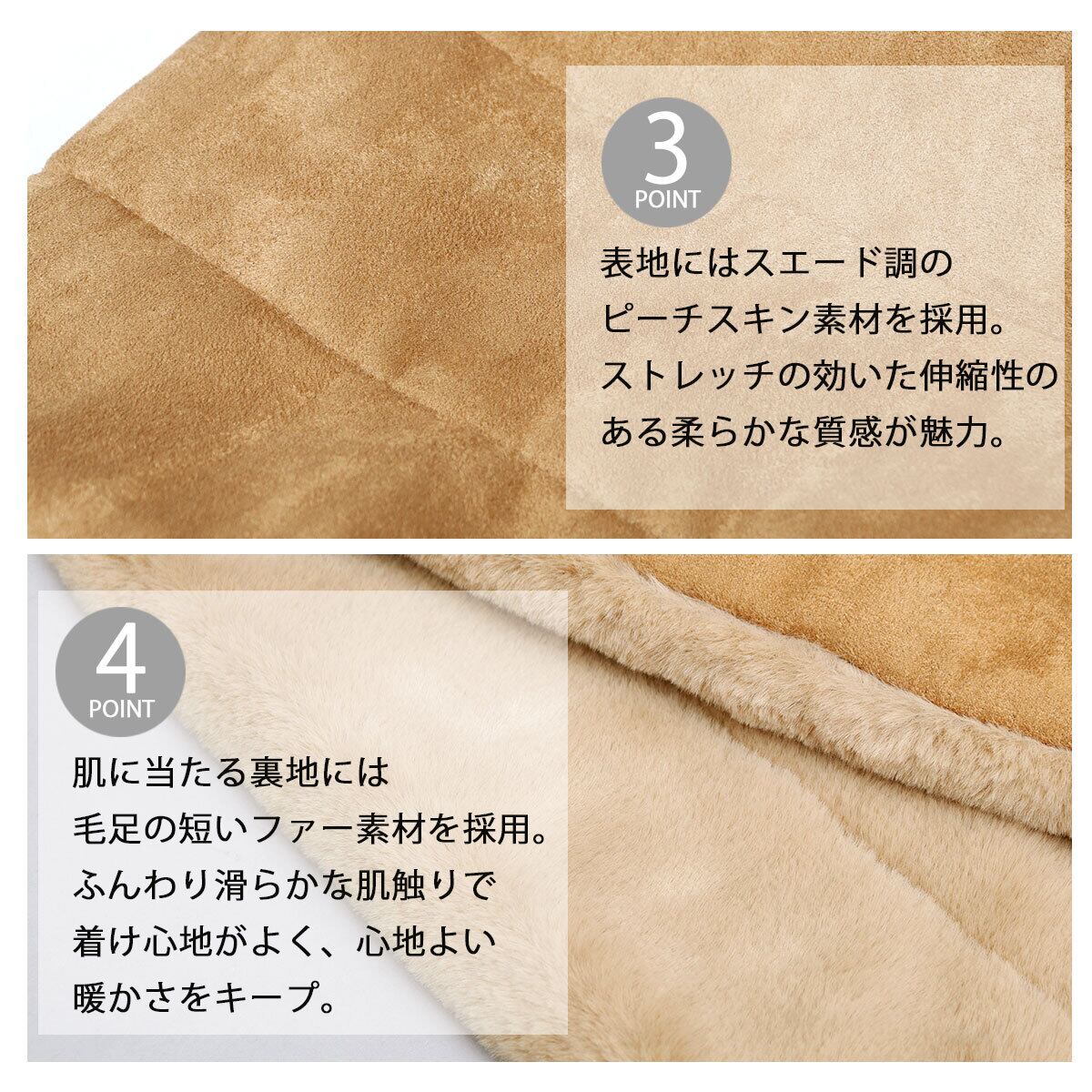 肌に当たる裏地には、毛足の短いファー素材を採用。ふんわり滑らかな肌触りで、着け心地がよく、心地よい暖かさをキープ。