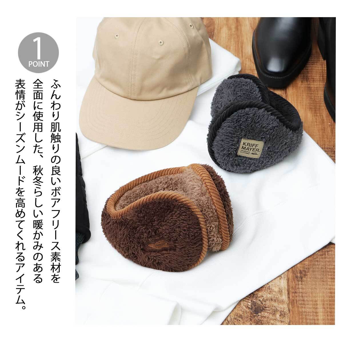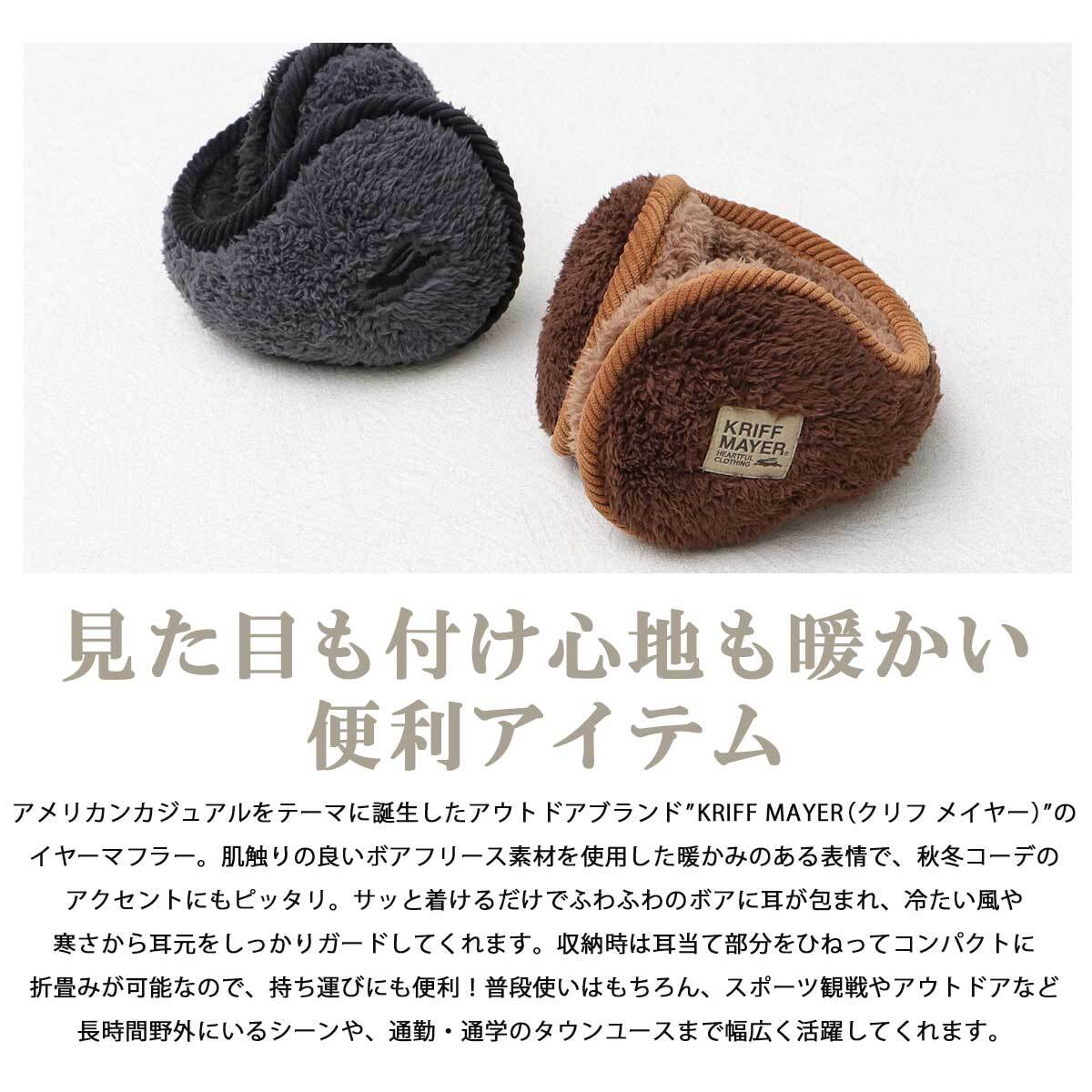アメリカンカジュアルをテーマに誕生したアウトドアブランド”KRIFF MAYER(クリフ メイヤー)”のイヤーマフラー。肌触りの良いボアフリース素材を使用した暖かみのある表情で、秋冬コーデのアクセントにもピッタリ。サッと着けるだけでふわふわのボアに耳が包まれ、冷たい風や寒さから耳元をしっかりガードしてくれます。収納時は耳当て部分をひねってコンパクトに折畳みが可能なので、持ち運びにも便利!普段使いはもちろん、スポーツ観戦やアウトドアなど長時間野外にいるシーンや、通勤・通学のタウンユースまで幅広く活躍してくれます。