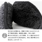 耳の当たる内側には、肌触りの良いふんわりとしたボア素材を使用。保温性に優れ、冷たい風や寒さから耳元をしっかり防寒。サッと着けるだけでふわふわのボアに耳が包まれ、冷たい風や寒さから耳元をしっかりガード。