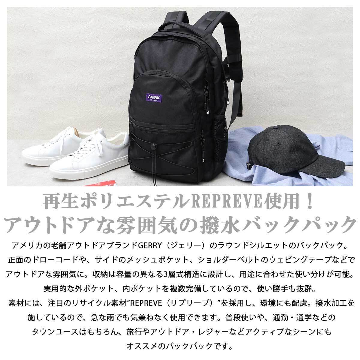 アメリカの老舗アウトドアブランドGERRY(ジェリー)のラウンドシルエットのバックパック。正面のドローコードや、サイドのメッシュポケット、ショルダーベルトのウェビングテープなどでアウトドアな雰囲気に。収納は容量の異なる3層式構造に設計し、用途に合わせた使い分けが可能。実用的な外ポケット、内ポケットを複数完備しているので、使い勝手も抜群。素材には、注目のリサイクル素材”REPREVE(リプリーブ)”を採用し、環境にも配慮。撥水加工を施しているので、急な雨でも気兼ねなく使用できます。普段使いや、通勤・通学などのタウンユースはもちろん、旅行やアウトドア・レジャーなどアクティブなシーンにもオススメのバックパックです。